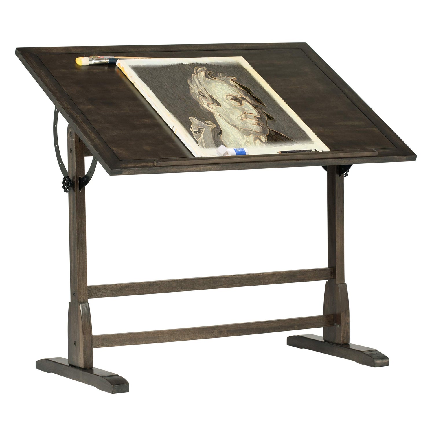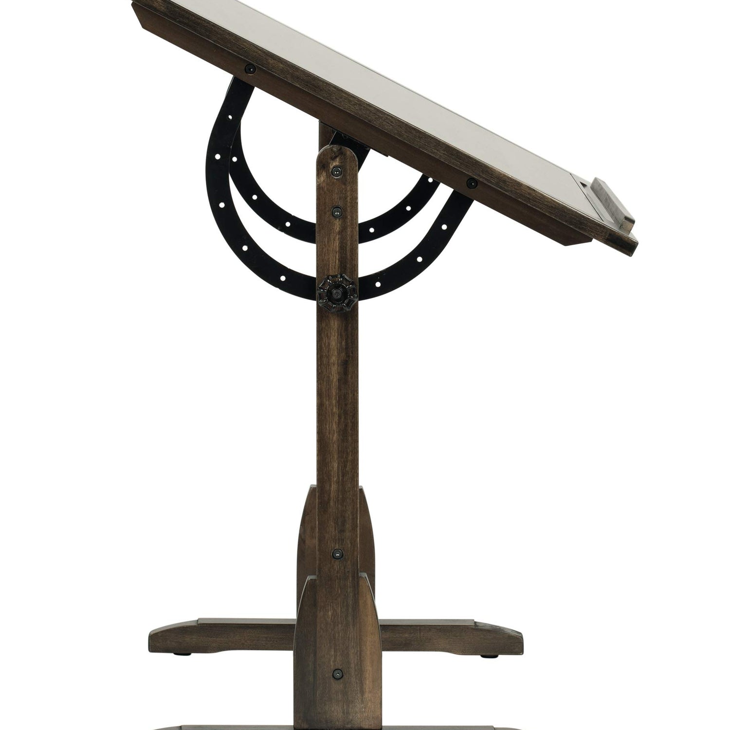 Details: The classic design of the Vintage Wood Drawing/Drafting Table (42"W) by Studio Designs is reminiscent of turn-of-the-19th-century furnishings. It features ample work space on the elegantly distressed wood finish with a built-in pencil groove. The antique finished wood top adjusts in angle from 0 to 90 degrees for versatility. Solid wood frame and metal hardware for durability. The main work surface is 42'' W x 30''D.