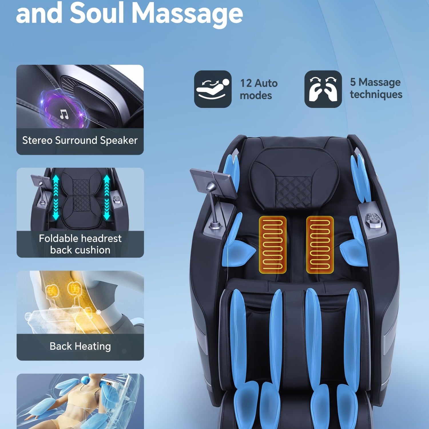 - 12 automatic modes and 5 massage techniques are designed into this full body massage chair. It also has heating on the back,whole body air bags and bluetooth speaker. You can enjoy a professional massage at home!