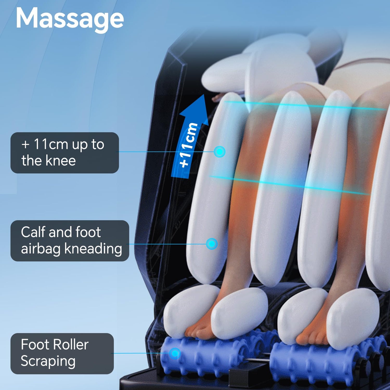 - Calf height increase 11cm of the massage chair.Massage area up to the knees. The footrest is set up with airbags and rollers for kneading and gua sha massage of the feet,And can be adjusted by 3 levels.