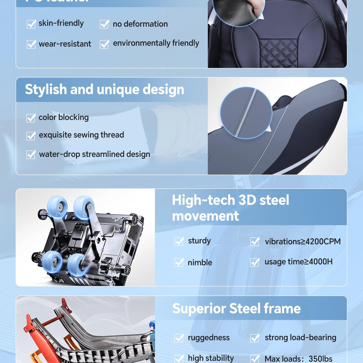 - Newly upgraded massage chair with better materials and design.Lychee grain PU leather and color patchwork exterior is paired with internal high-tech steel 3D movement and frame. Added wireless phone charging feature in armrest. You get a higher level massage experience in the same price.