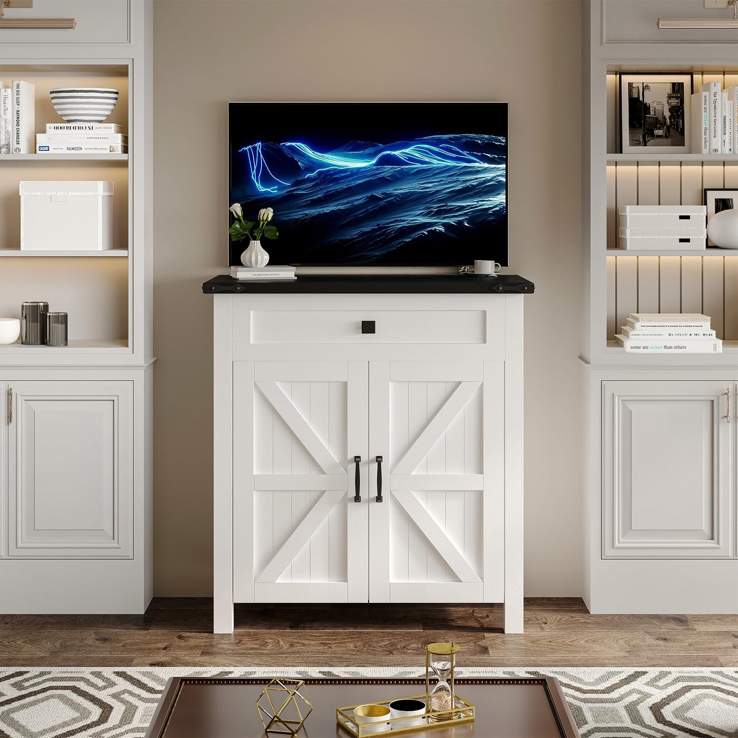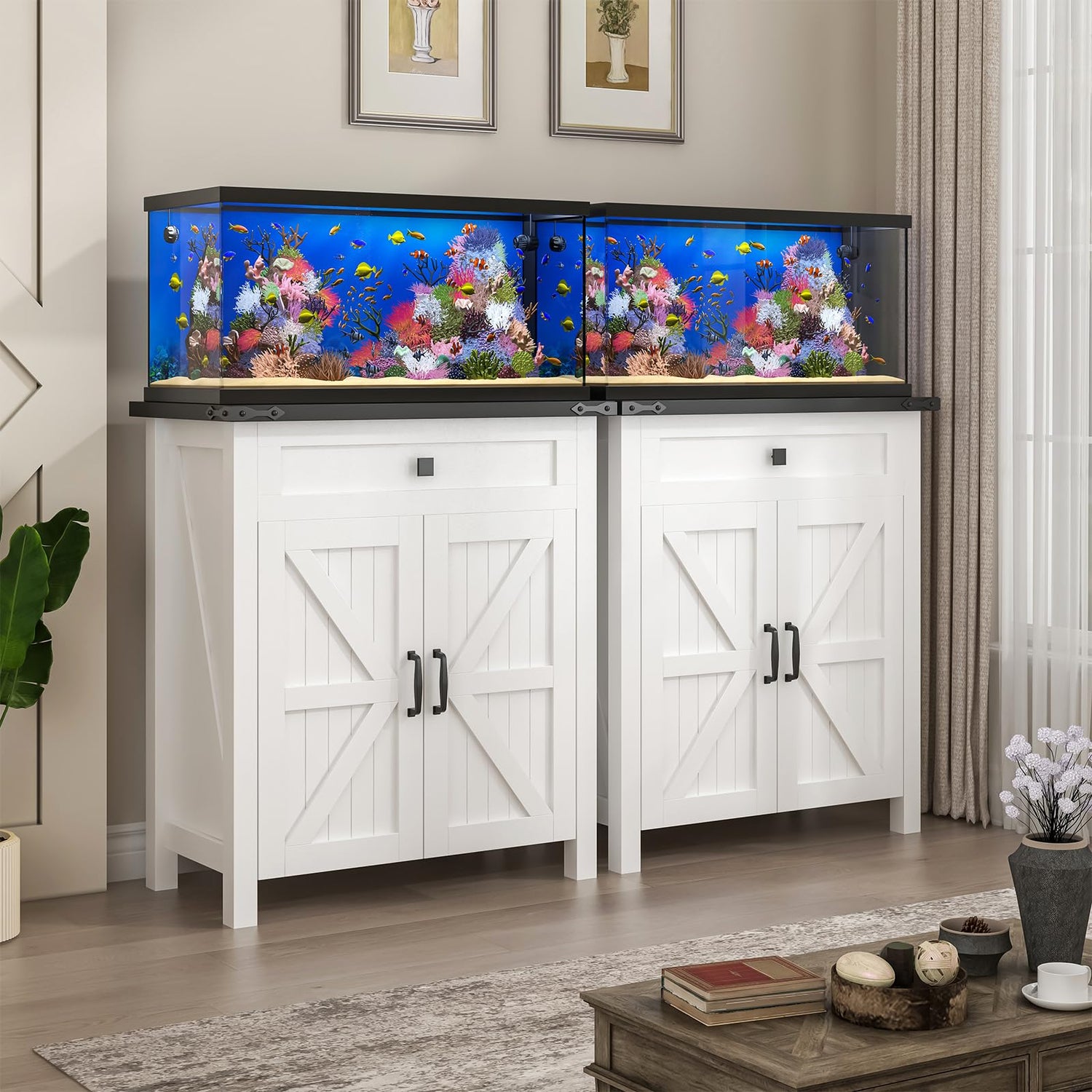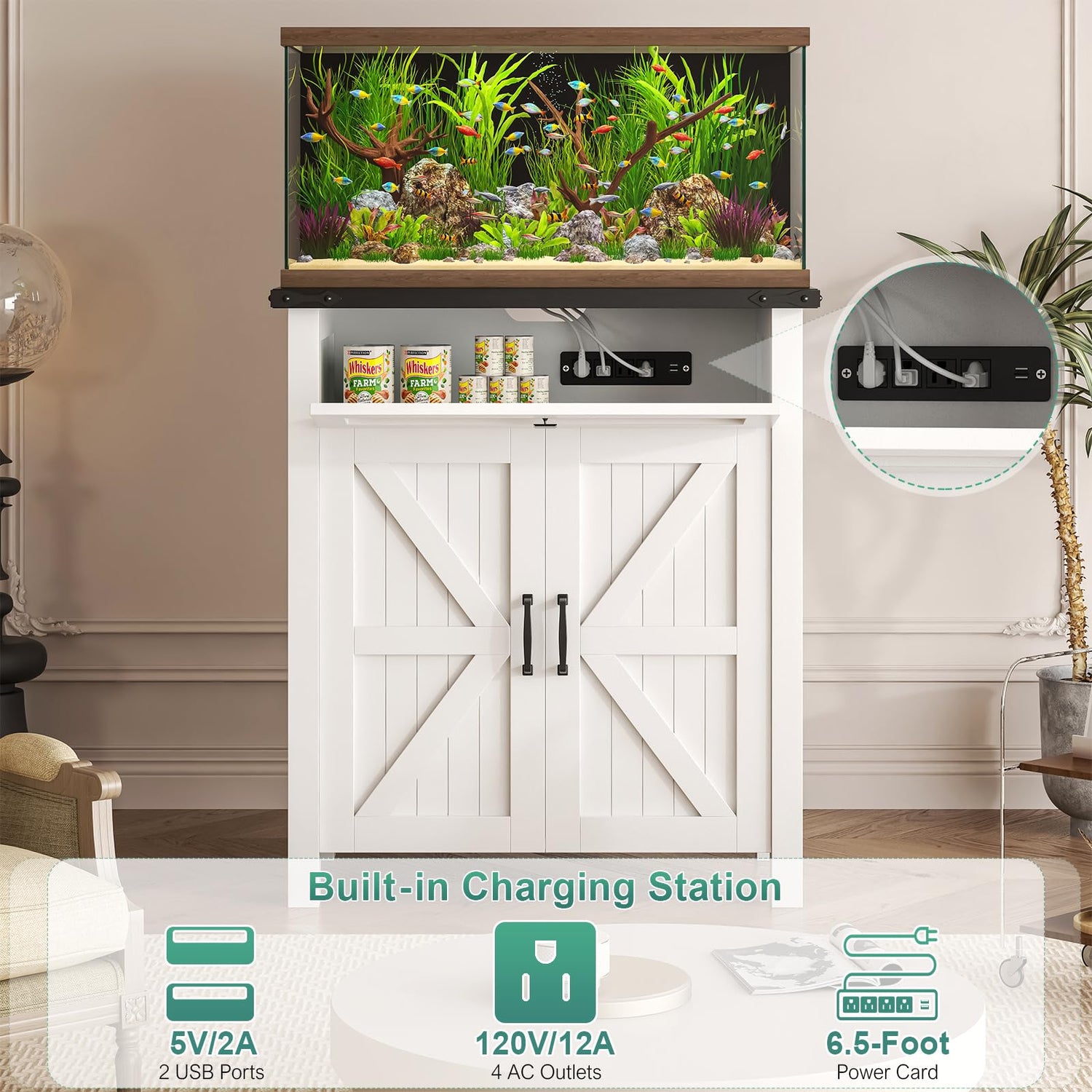Suadism 20 Gallon Aquarium Stand With Charging Station, Farmhouse Fish Tank Stand, Reptile Tank Stand Terrarium Stand with Drawer and Cabinet Storage, Sturdy Heavy Duty 27.6"×15.7" Tabletop - White