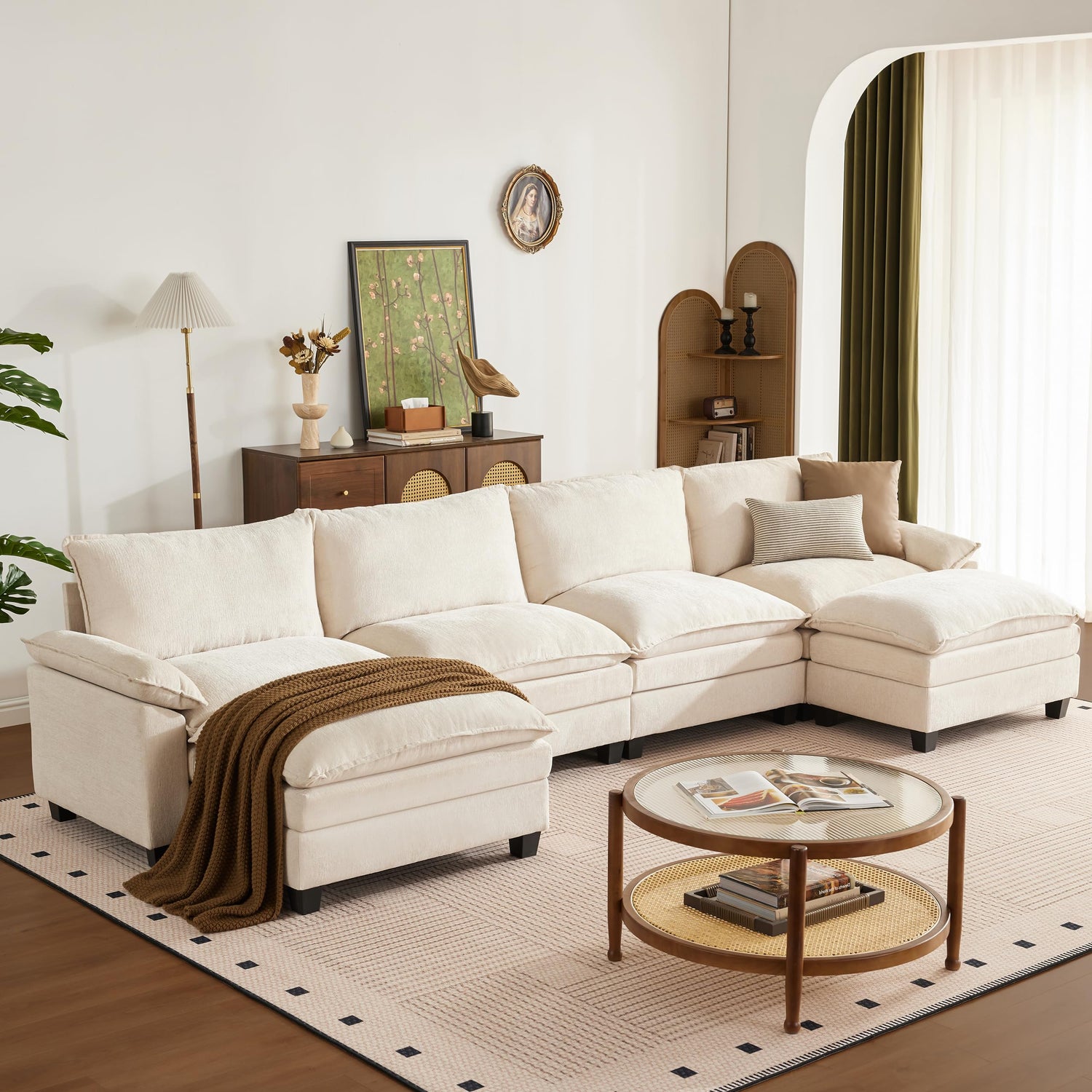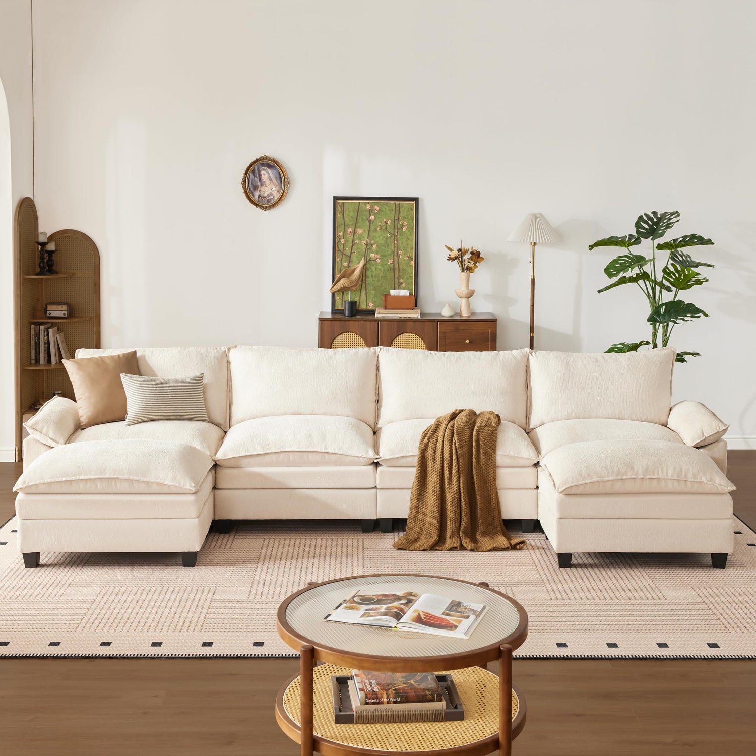 SUAWY 147 Inch Big Comfy Couch with Ottoman, 6 Seat U Shaped Couches, Cloud Modular Sectional Sofa, Modern Cloud Couch Sectionals, Sectional Couches for Living Room, Oversize Deep Seat Sofa, Beige
