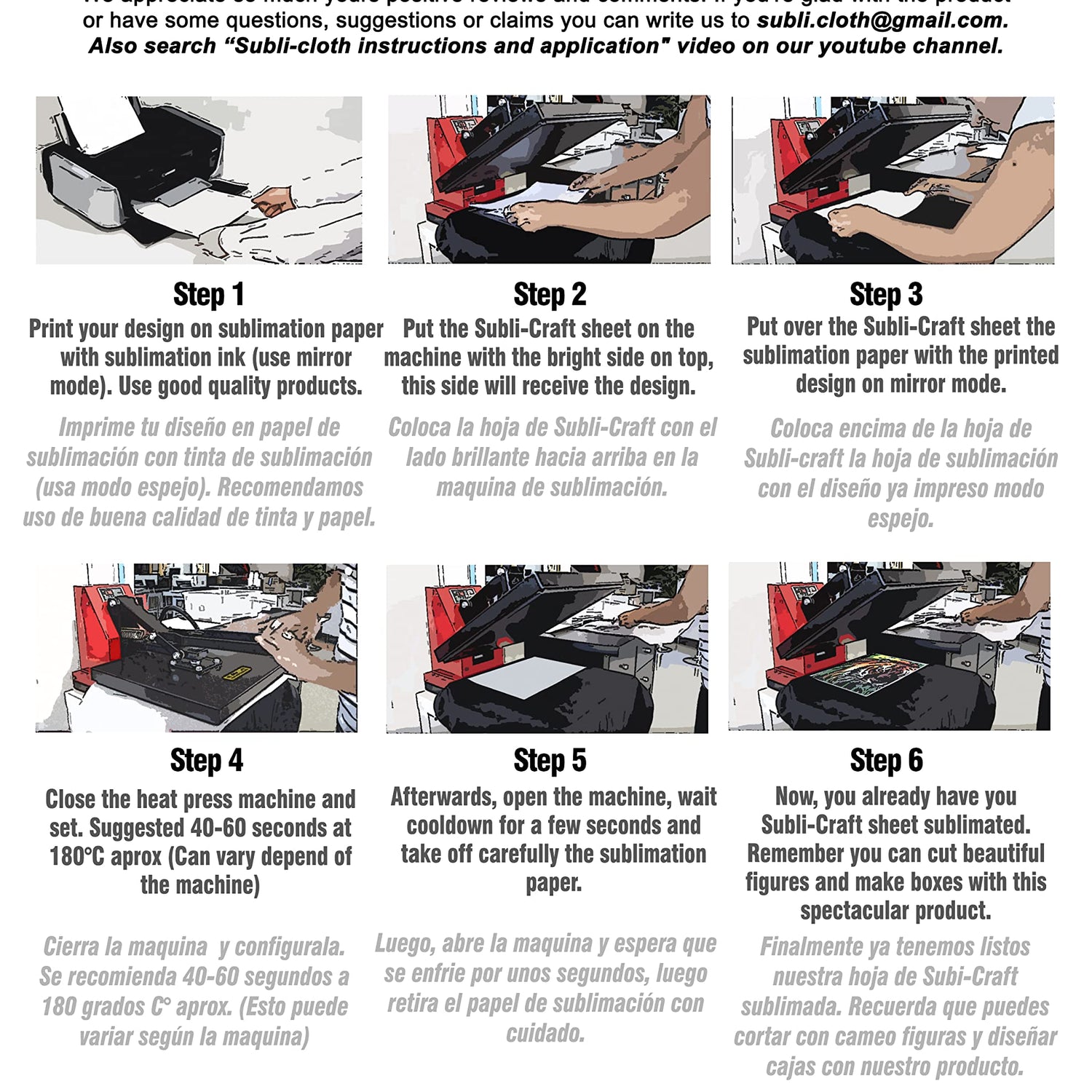 Details: Subli-Craft by Subli-Cloth is a new sublimation product. It’s a revolutionary solution to make custom sublimated designs on with cardboard. This cardboards with special treatment allow you to sublimate with excellent quality, beautiful and bright designs to make giftcards, boxes, presenrations cards or anything you can imaging. The ideal material for the best on sublimation industry. Feature (Characteristics) Cardboard. White color, smooth and bright finish. Build with a special finish layer. Use Instructions Print the design (mirror print) on sublimation paper. Put the Subli-Craft sheet on the heat press machine with the bright side on top. Put the printed sublimation paper over the Subli-Craft sheet. Close the heat press machine and program the timing. We recommend 180 centigrade and 40-60 seconds. (These parameters can vary depending of the machine) Open the machine and take off the sublimation paper with careful. You finished. You already have your Subli-Craft sheet sublimated. General Recommendations We recommended make preliminary tests of the product to calibrate the sublimation machine. We recommended to make some test before the final production. The heat and timing used can change and be different depending of the specifications of the machine you will use. Also the result can vary depending the ink & sublimation paper used.