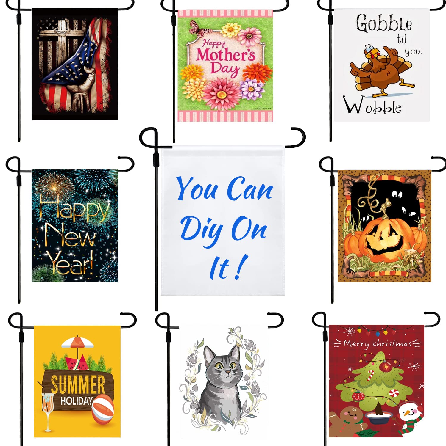 - Custom Garden Flags Set: The package comes with 13 pcs blank garden flags ,it can be printed with different themed patterns to match parties of various festival themes. This Seasonal flag with about 2.0-inch wide hanging sleeve, is easy to install and fits all standard garden flag poles, flag pole bracket stands and hangers, etc. (stand not included)