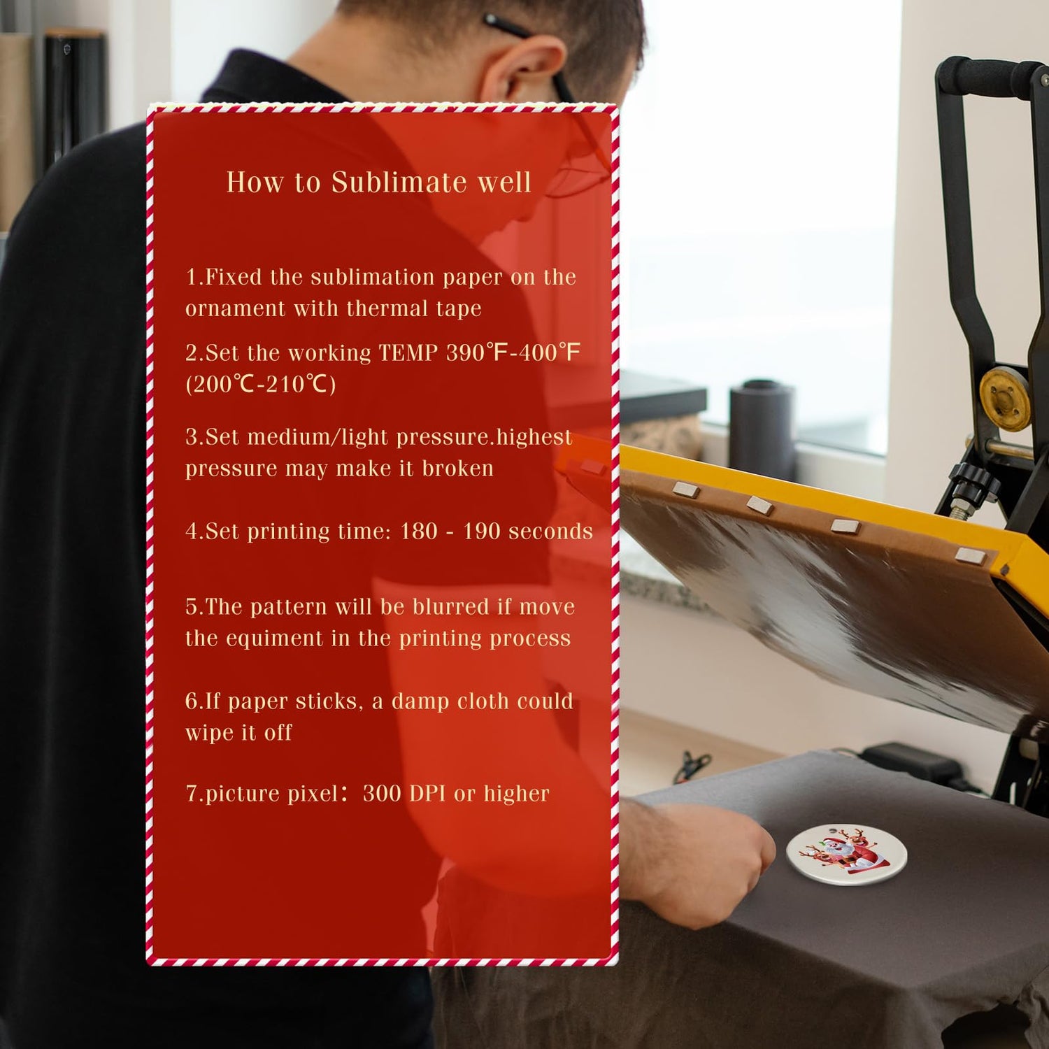 - WARM TIPS:control the working TEMP 390¨H-400¨H(200¡æ-210¡æ); Medium or light pressure; Printing time is 180 - 190 seconds