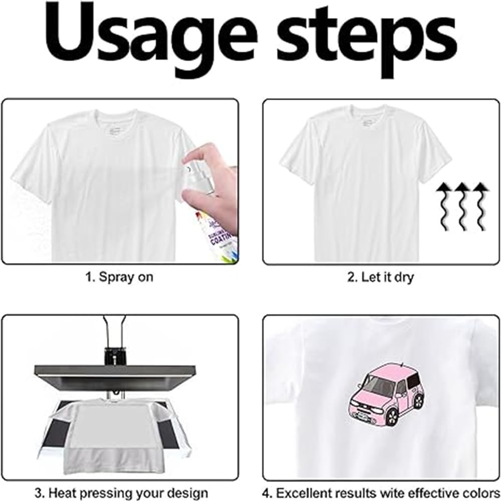 - ☘️【One Step Sublimation Coating Spray】 This sublimation spray for cotton T shirt is ready to use in one single step, without the need for mixing with other liquid or solutions. Just spray directly into the sublimation objects, let it dry and your sublimation blank is good to go for a heat press.
