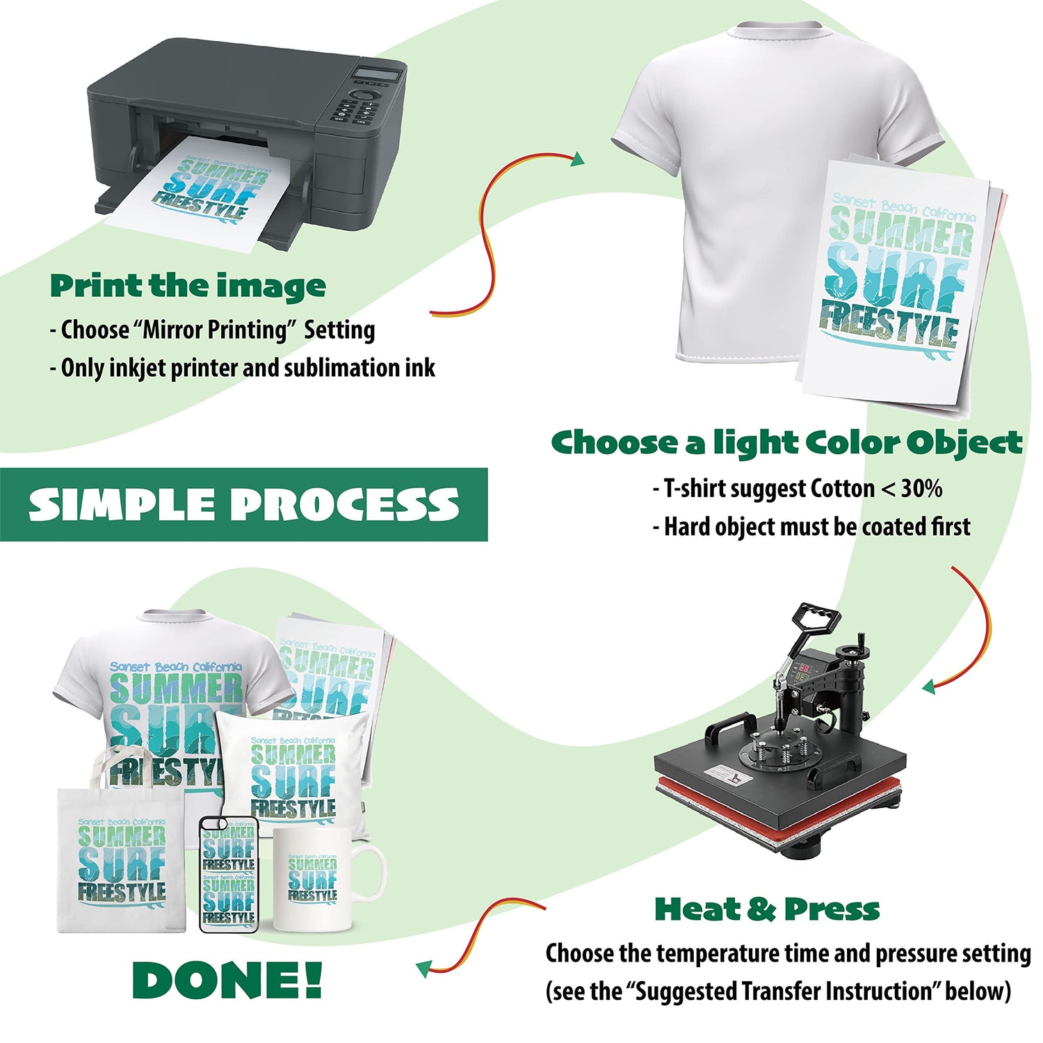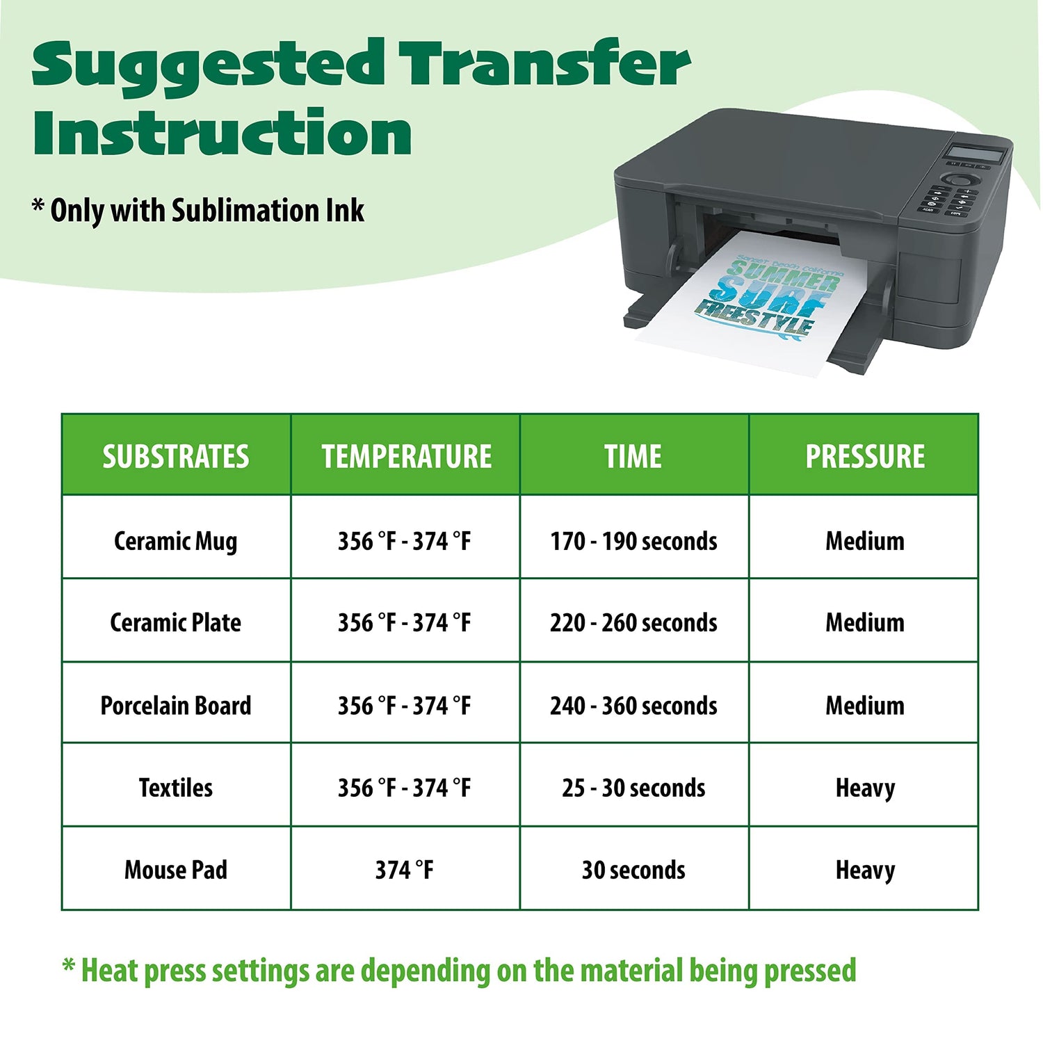 - Work with Any Inkjet Printers with Sublimation Ink, make sure the printer has the piezoelectric printhead, also you have the sublimation Ink and the Heat press machine. NO iron.