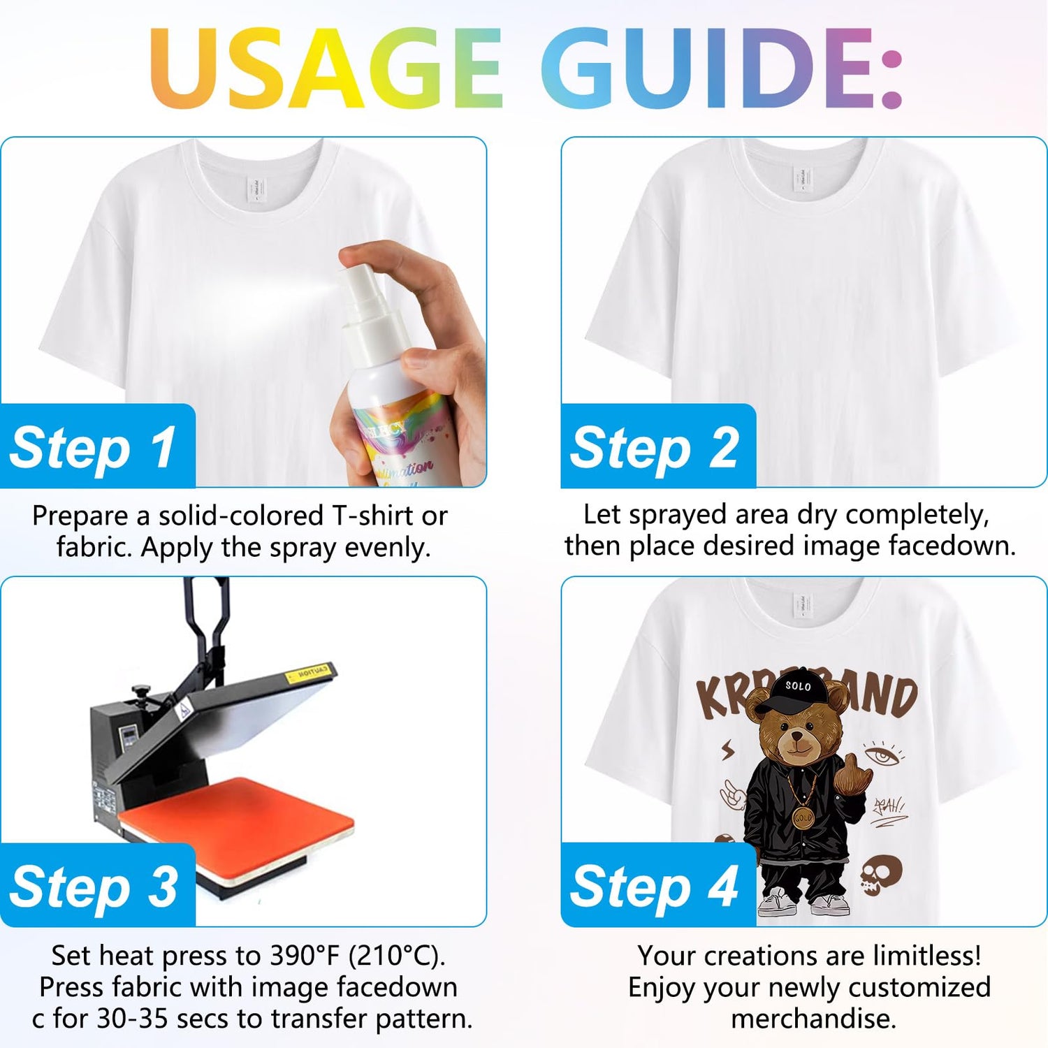 - 🌈 This coat spray for fabrics is made with premium quality, safe and ingredients, an improved formula that dries quickly and greatly enhanced adhesion between ink and print surface. (Note: Wash after 24H of use, works best on light-colored fabrics)