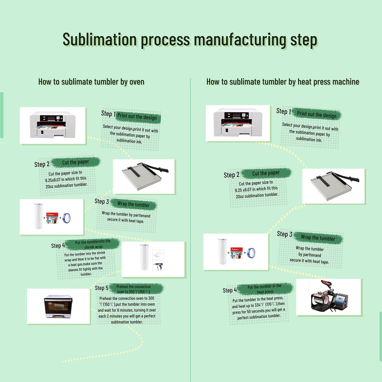 - Two Way to Sublimate Your Tumbler: If you choose heat press machine to sublimate your tumblers,Recommended time is 50 seconds,Recommended Temperature is 334 Degree Fahrenheit,If you choose oven to sublimate your tumbler,Recommend time is 6 minutes,Recommended temperature is 300 Degree Fahrenheit; Attention:Both best done with sublimation shrink wrap