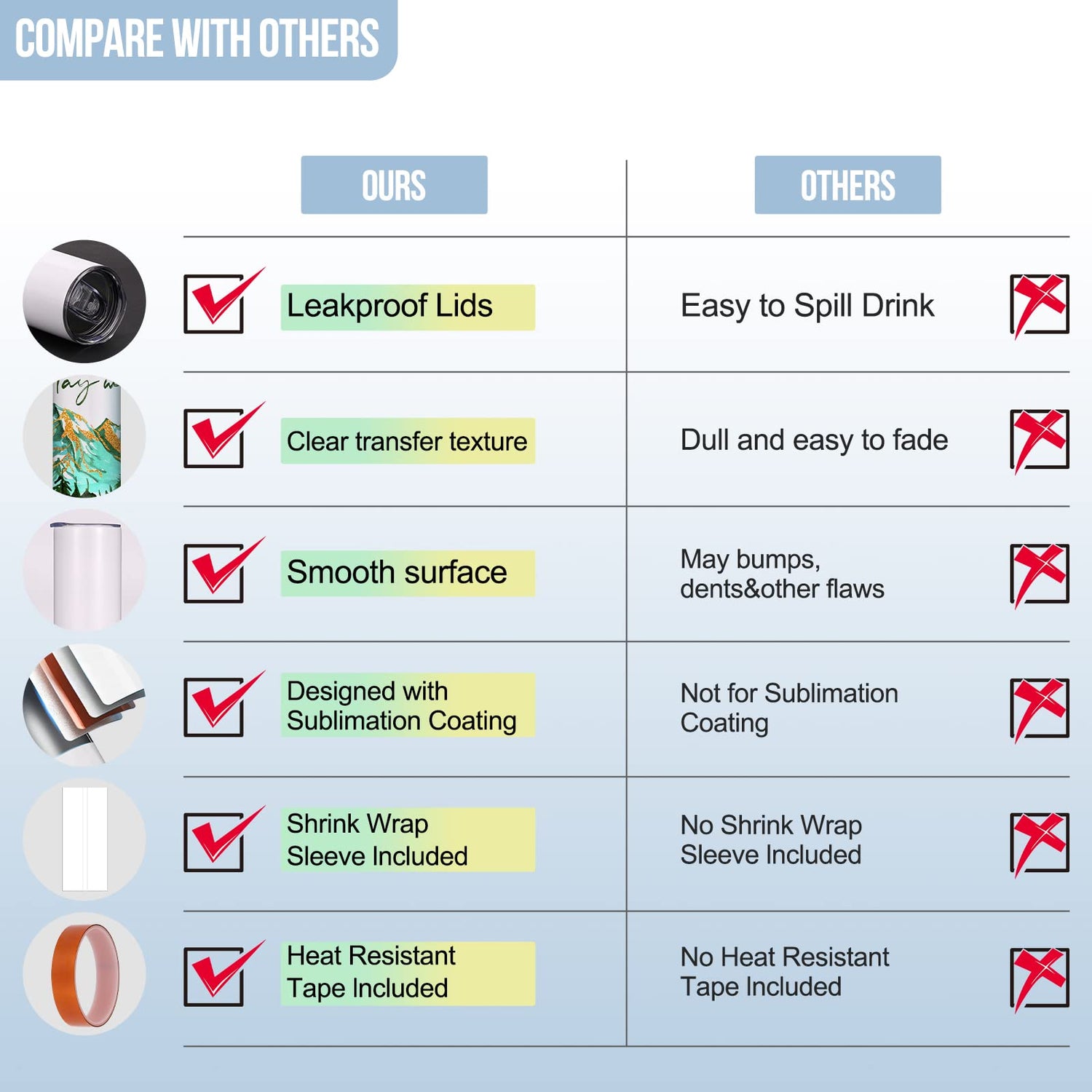 • 🎁【Package Includes】Our 20 oz sublimation tumbler skinny straight come each with its own gift box, ribbon,heat tape,lid, straw, brush and rubber bottom. What's more, bulk blank tumblers also include sublimation shrink wrap and sublimation paper. All you needs is ready, just print-wrap-bake, you will get a unique and distinctive sublimation tumbler. Perfect for Creating Photo, Promotions, Gifts, Personal Keepsakes so You Can Print Anything on it Through Heat Press or Oven