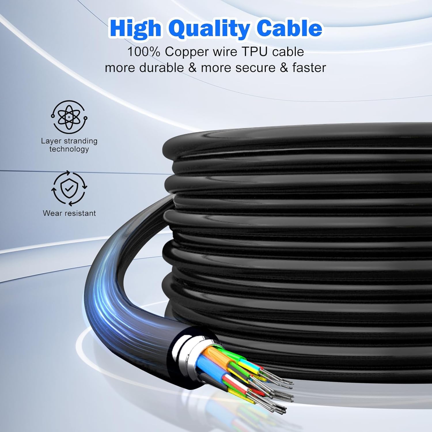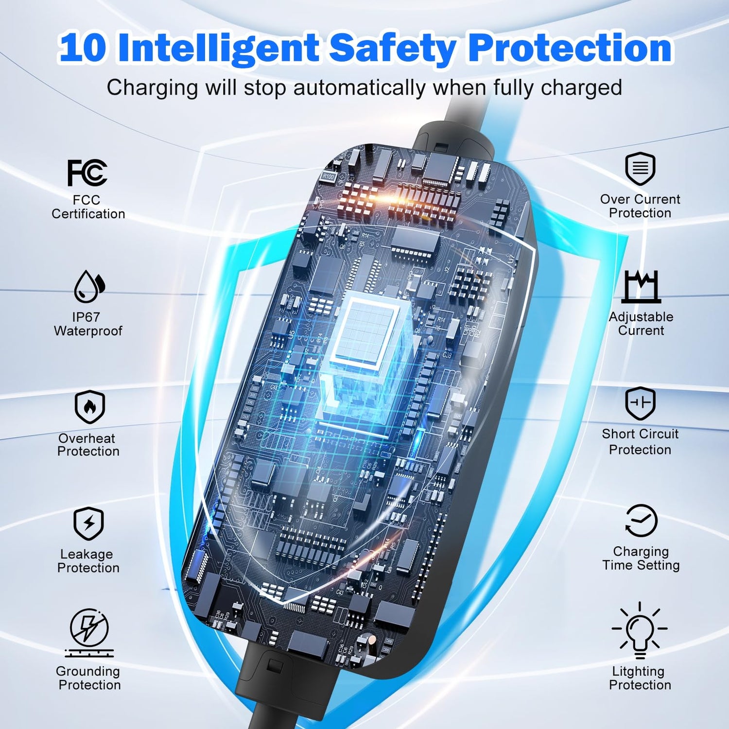 - 【More Focus on Safety】 We added more hard materials to the shell to make the overall hardness higher. It will not break even if a family car runs over it. FCC certification ensures product quality and safety of use. Our charger equipped with intelligent chipset that provides overcharging, overvoltage, overheat, overcurrent, short circuit and leakage protection. IP67 waterproof protect internal circuits. The gaps are small and it is difficult for water to enter. The working temperature ranges from -22°F to 122°F. Come with a locking designed to ensure that it cannot be easily pulled out in a locked state. 12000+ plug and unplug tests. 100% copper wire tpu cable.