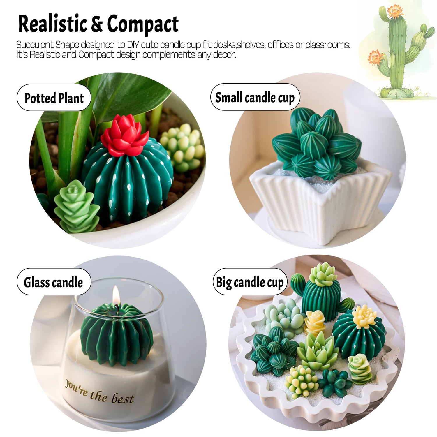 Succulent Wax Molds for Candle Making 10 Pack 3D Cacti Silicone Candle Mold Handmade Cactus Flower Plant Decorate Cement Resin Casting Soap Ornament Craft Mold Chocolate Cake Fondant Moulds Home Decor