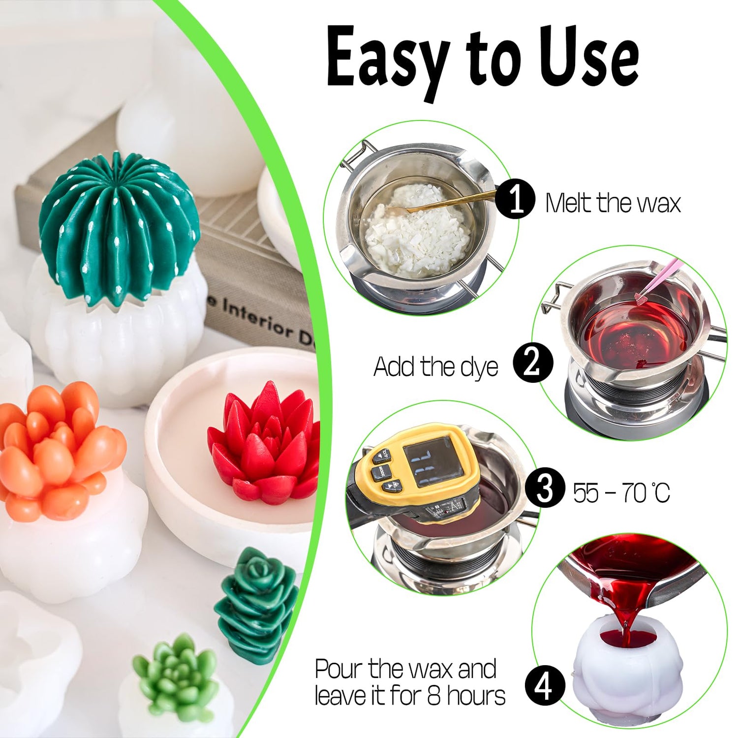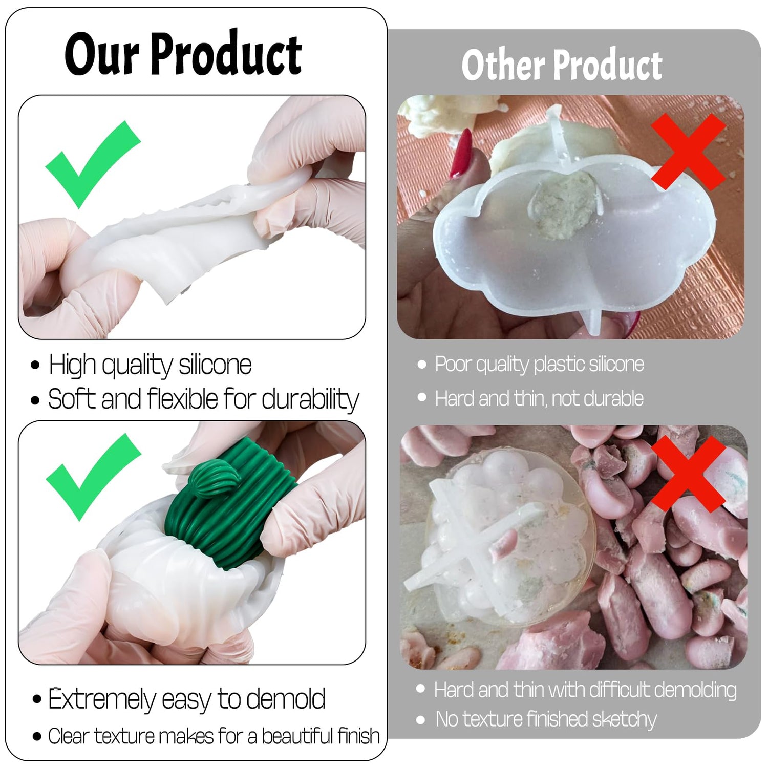 - Easy to Use: Place the mold in flat place, pour melt candle/wax/soap or resin, waiting some time the material solidification, and then demold. Then clean the wax molds with soap water and storage them away from direct sunshine and dust