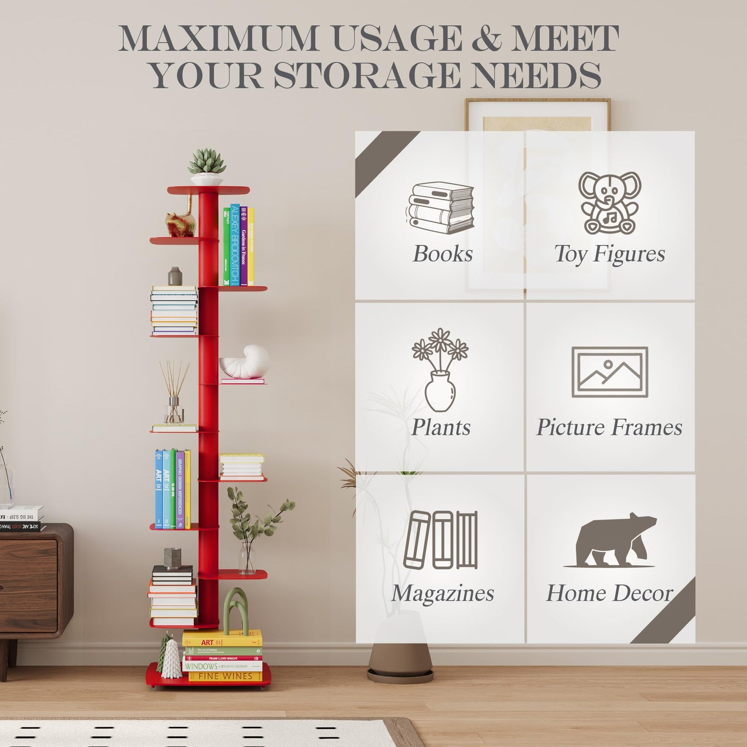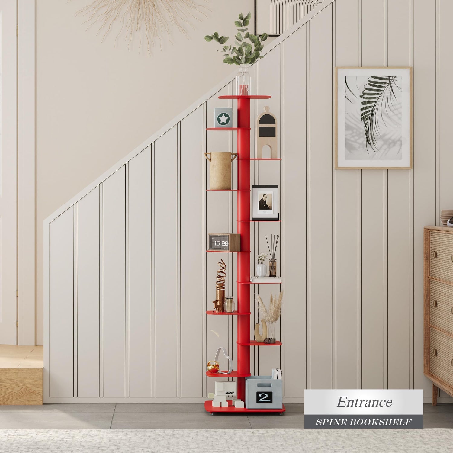 Suchtale Spine Bookshelf, Vertical Spine Book Tower, 11-Tier Metal Bookcase, Book Organizers Display Storage Rack for Study & Living Room, DIY Book Shelf for Decor, Red