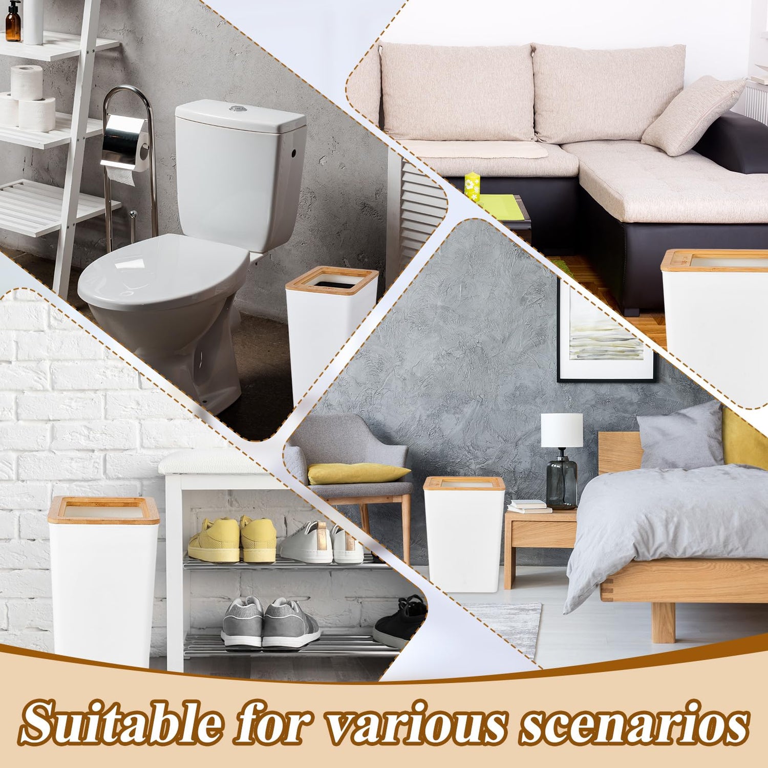 Suclain 2 Pcs Slim Trash Can 2.3 Gal, Small Wastebasket with Semi Open Bamboo Lid Plastic Waste Basket Rectangular Garbage Container Bin Trashcan for Bathroom Bedroom Kitchen Office Living Room Home