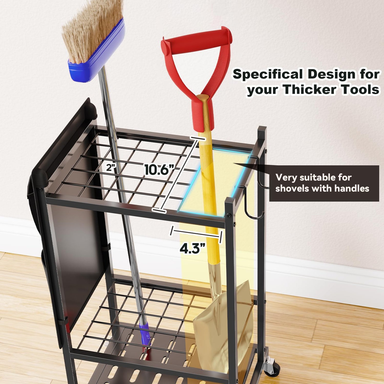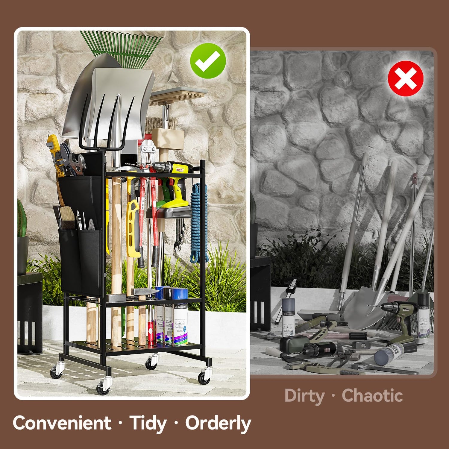 - 【Rolling Tool Rack】The garden tool organizer comes with 4 Industrial Wheels wheels that smoothly move through thick grass and can easily be moved from indoors to outdoors. with built-in brakes on the front 2 casters to keep the tool holder in position and add stability