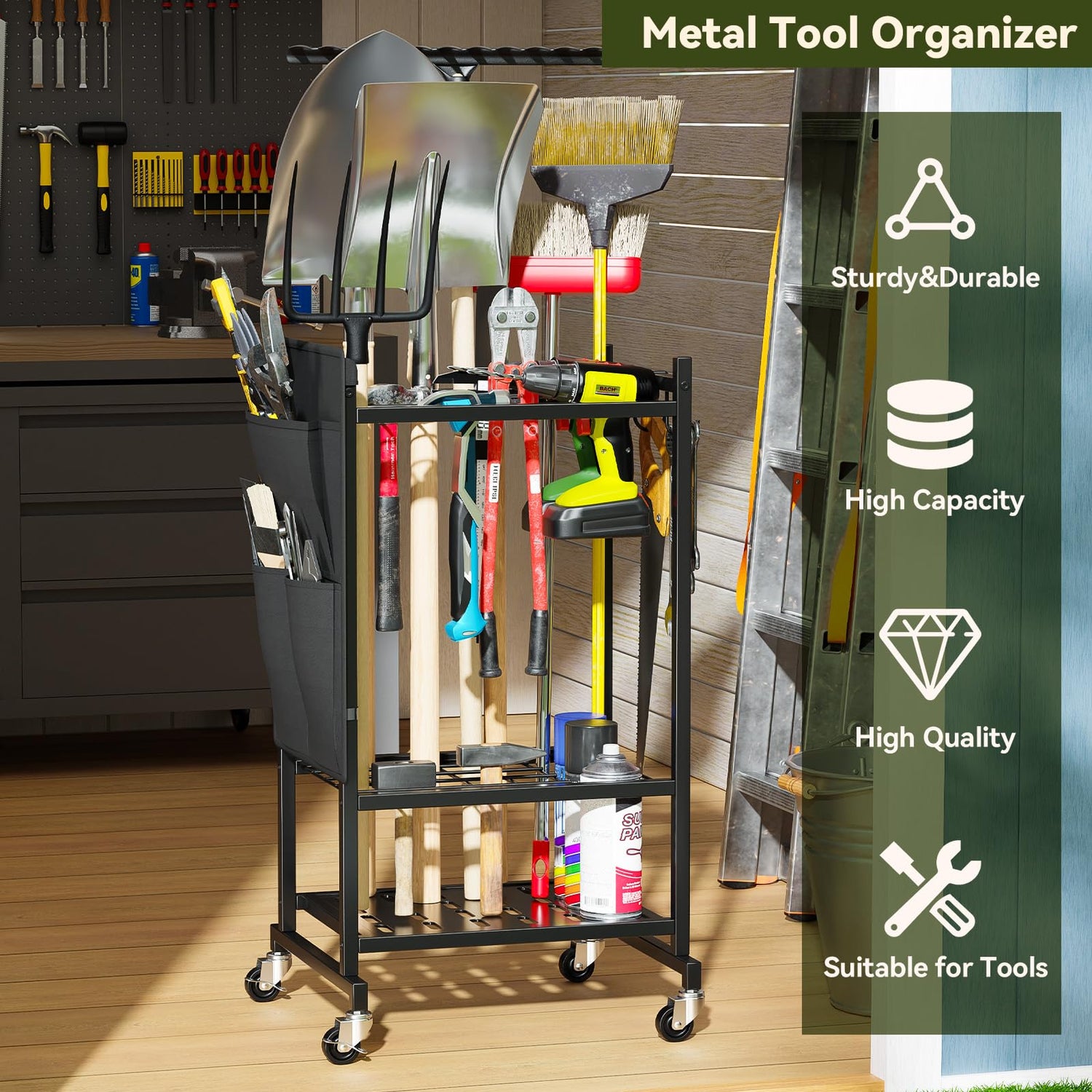 SUFAUY Garden Tool Organizer, Rolling Heavy-Duty Garage Tool Stand, Yard Storage Rack with Casters and Hooks, Black