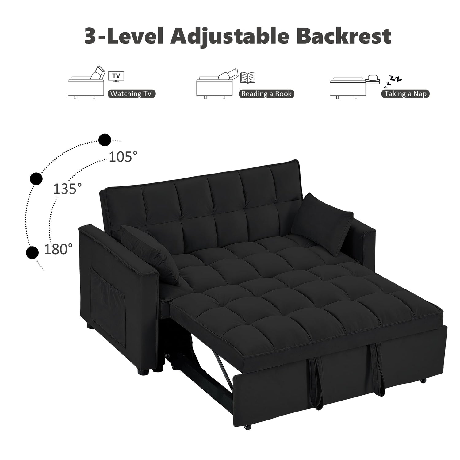 - 【3 Recline Angles】Designed with three adjustable backrest angles, ranging from 105° to 180°, pull out couch bed sleeper allows you to enjoy your favorite books or TV shows in a perfect relaxing position.