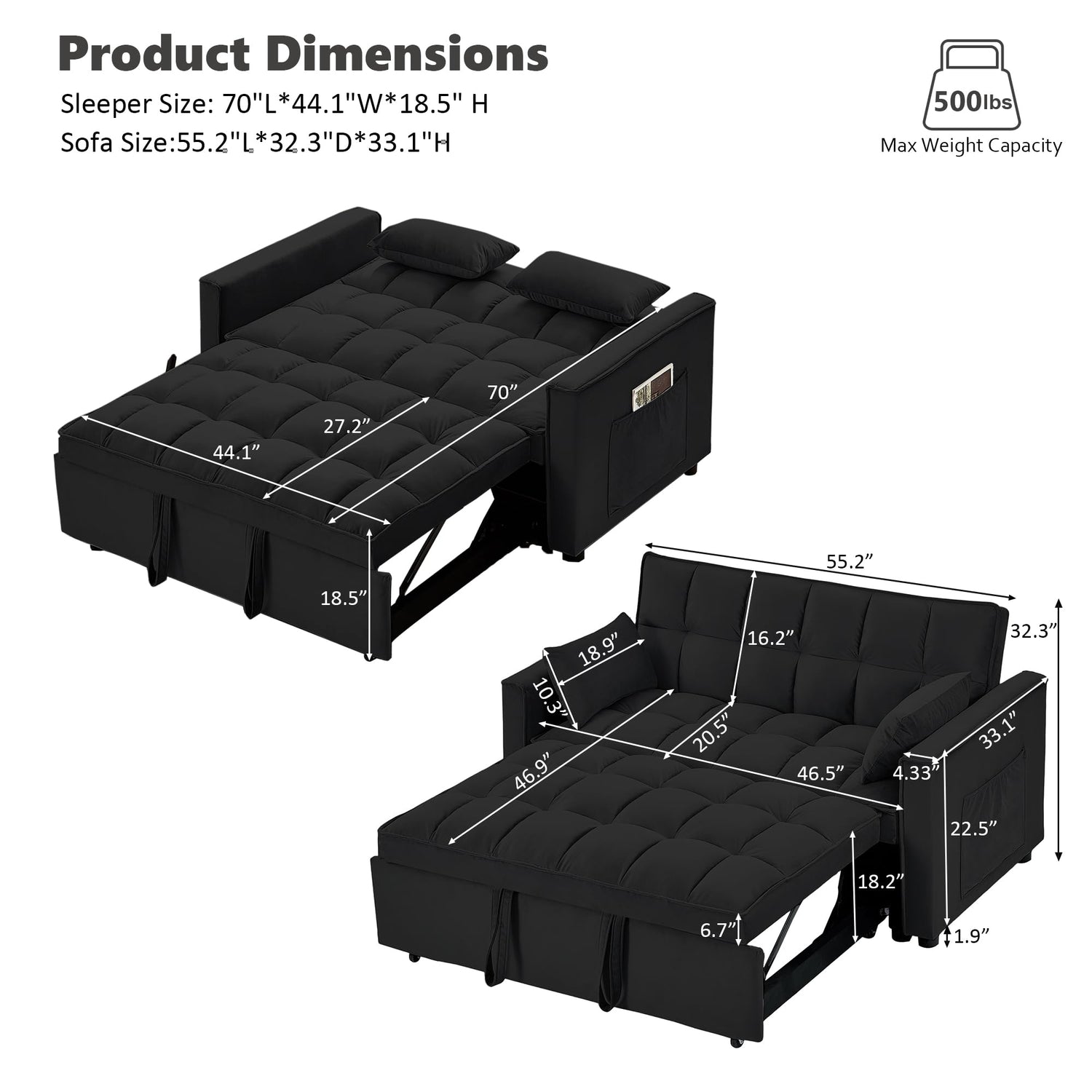 - 【Easy Installation】Sofa Size: 55" W*33.5" D*31.5" H, Sleeper Sofa Size: 70" D*44.3" W*18.5" H. Can be ssembled easily within 20 minutes to create a functional sleeper sofa. Even non-professionals can easily accomplish this.