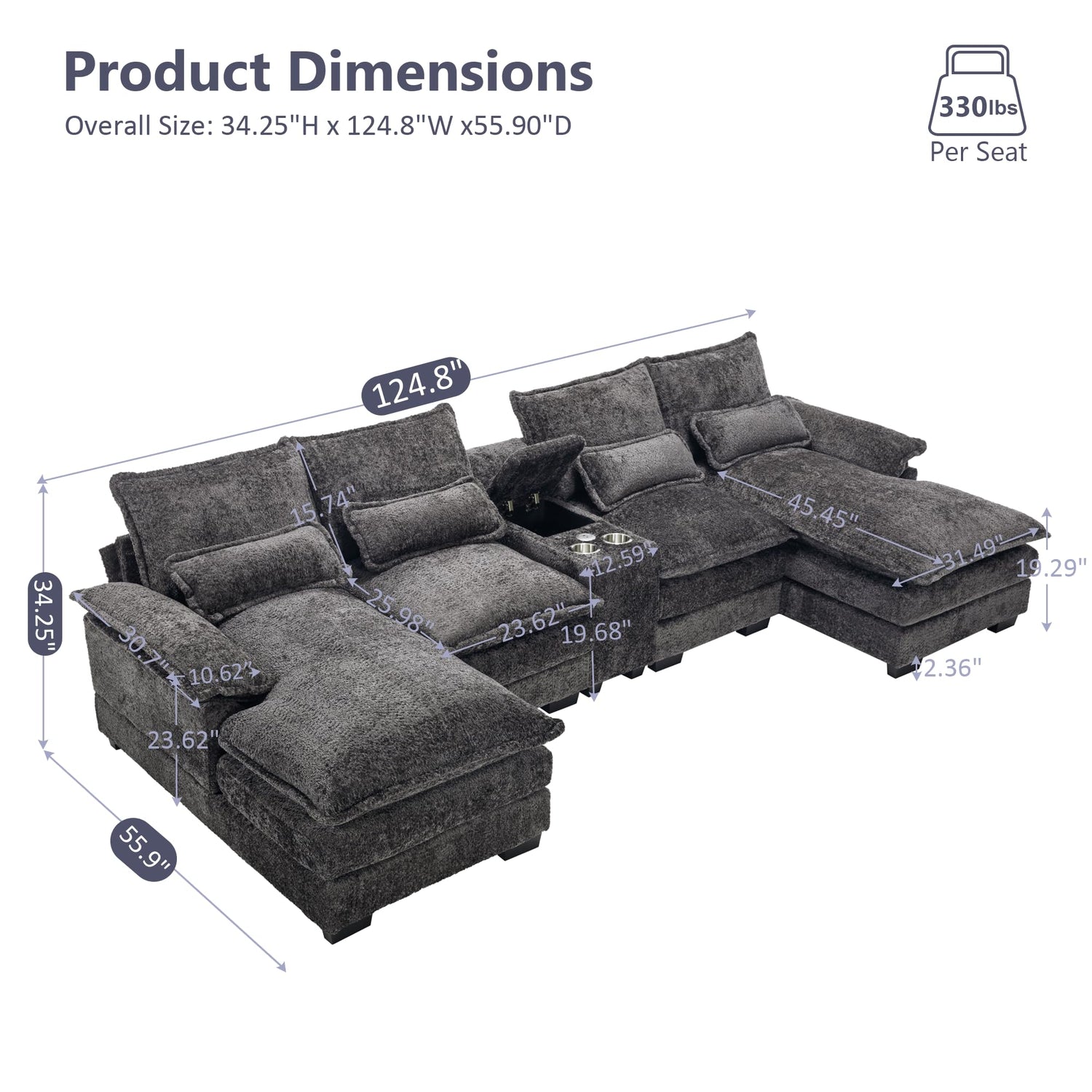 Suheww U Shaped Modular Sectional Sofa, 124.8" Cloud Couch for Living Room, Grey Fluffy Chenille Couch with Console Cupholders and USB Port Comfy Sofas for Apartment Studio Office