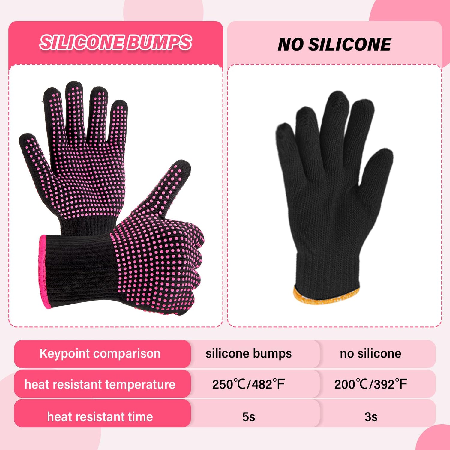 - Heat Protection: our heat resistant gloves are designed with quality silicone bumps to effectively isolate your hands from heat sources up to 250 Centigrade/ 482 Fahrenheit; Instantaneous contact with a heat source will no longer result in burns, ensuring your safety in various scenarios