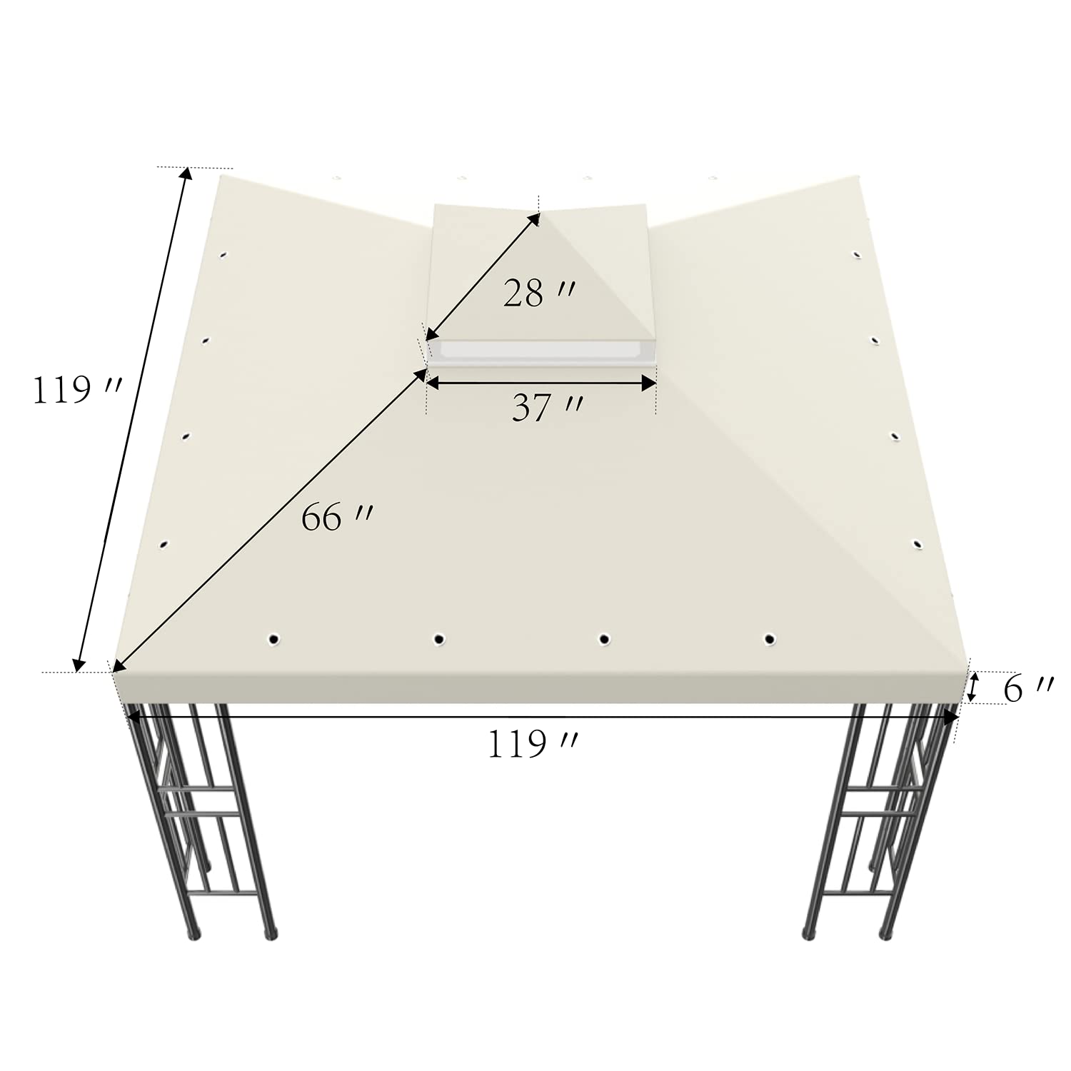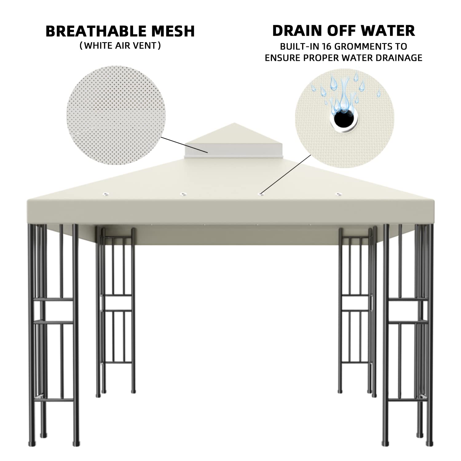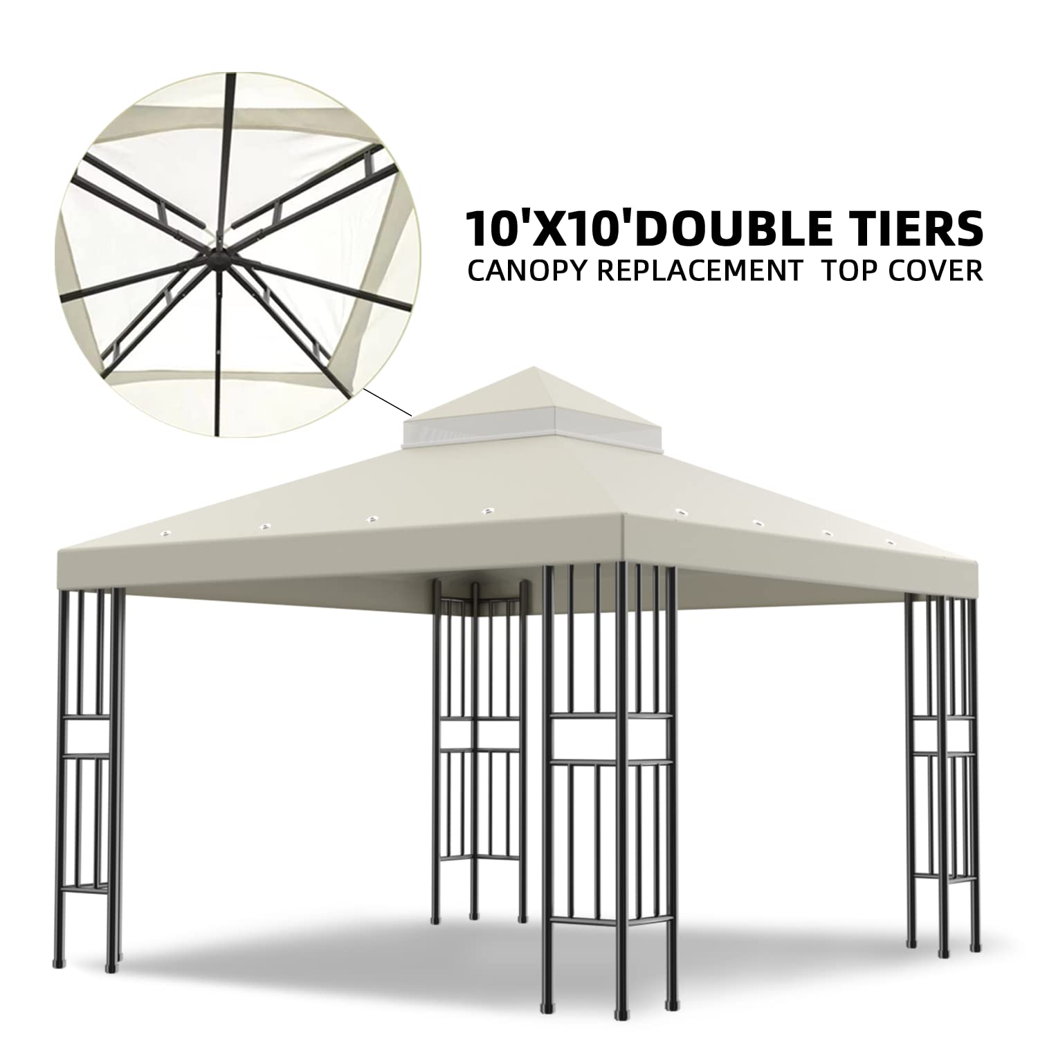 Details: "10' X 10' Canopy Replacement Top Cover. It's a wasteful to buy an entire new gazebo when you can simply replace the Canopy Cover. Our 10' X 10' (two-teir) cover is made with 180g PA Polyester w/ Water Resistance and will fit most standard 10' X 10' gazebo. It features an top and lower teir with an mosquito netting in between for ventilation. Feature: - 10' x 10' Canopy Cover (120"" x 120"") - Top Tier Cover (36"" x 36"") - Designed for Double-tier Gazebo Frames - Mosquito netting for ventilation - 180g PA Polyester w/ Water Resistance - Fit most standard 10' X 10' gazebo - Velcro tapes for easy attachment - Only include canopy cover, gazebo frame not included - NOTE: As the gazebo frame varies, please compare the size and specification carefully for the best match. Package Includes: 10' x 10' (Double Teir) Canopy Top Cover - Beige color Specification: Dimensions:120"" x 120"" base teir,36"" X 36"" top teir Material: 200g/sqm PA Polyester w/ Water Resistance Teir: Double-teir with mosquito net Color: Beige "