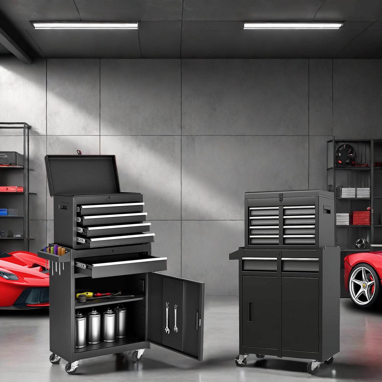 - Versatile and convenient design: Featuring six drawers in the top box and two in the bottom cabinet, this tool chest with wheels provides flexible storage options. Side handle and hooks keep tools within reach, perfect for garage or workshop setups