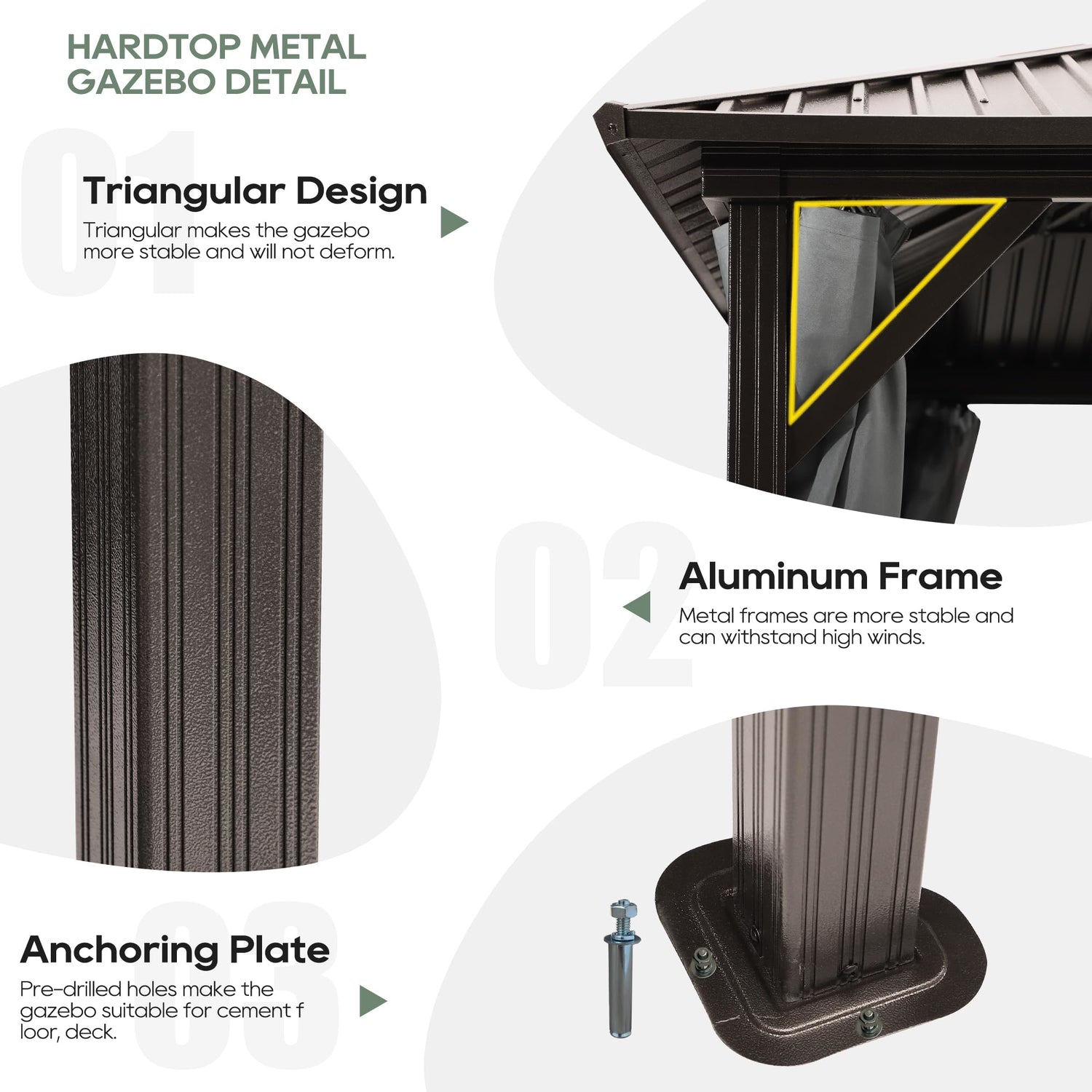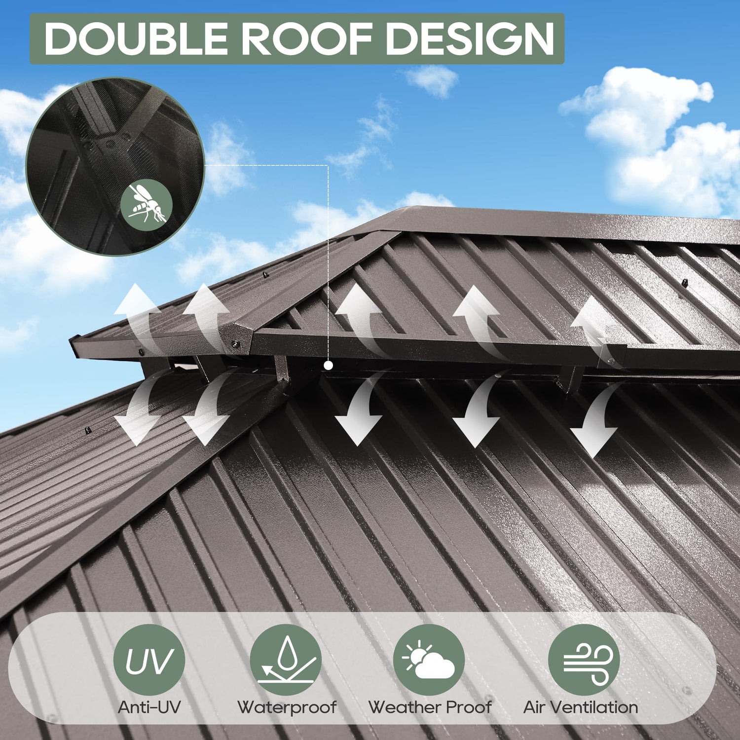 - 【Galvanized Steel Double Top】Instead of polycarbonate roof, our fade-resistant & rust-resistant galvanized steel roof effectively protects you from harmful UV rays and durable enough to withstand heavy snow and wind. This hardtop gazebo features a double roof design for easy ventilation,keeping the structure cool and comfortable on hot summer days.