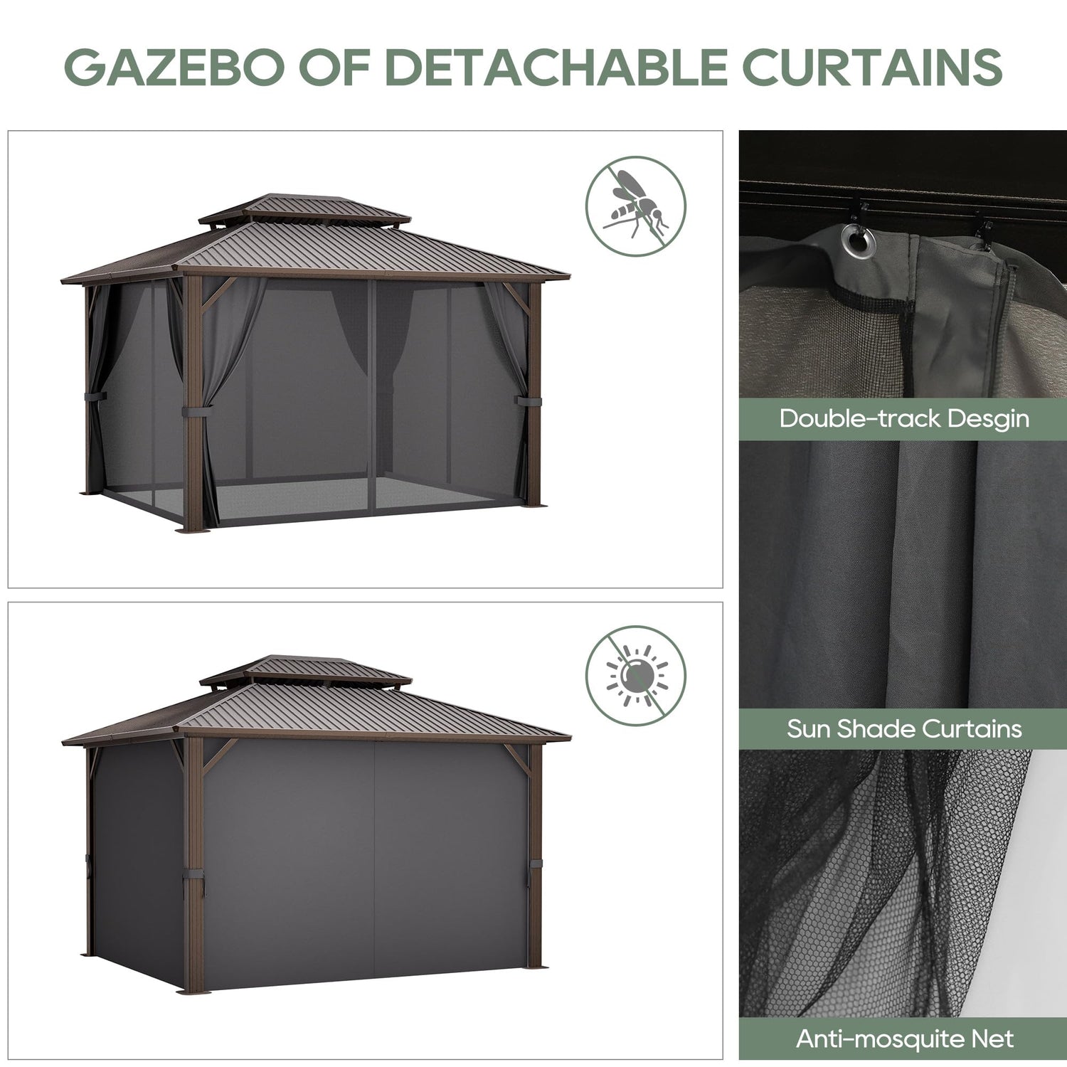 - 【Practical Design】The double-track system of the patio gazebo facilitates you to slide easily. Mosquito net provides better air circulation and protection from mosquitoes. Thickened curtains protect against UV rays and rain as well as provide a secluded space. Accompanied by two J and one U hooks with a weight capacity of 30 pounds, you can hang up the lights and fans to enrich the gazebo.