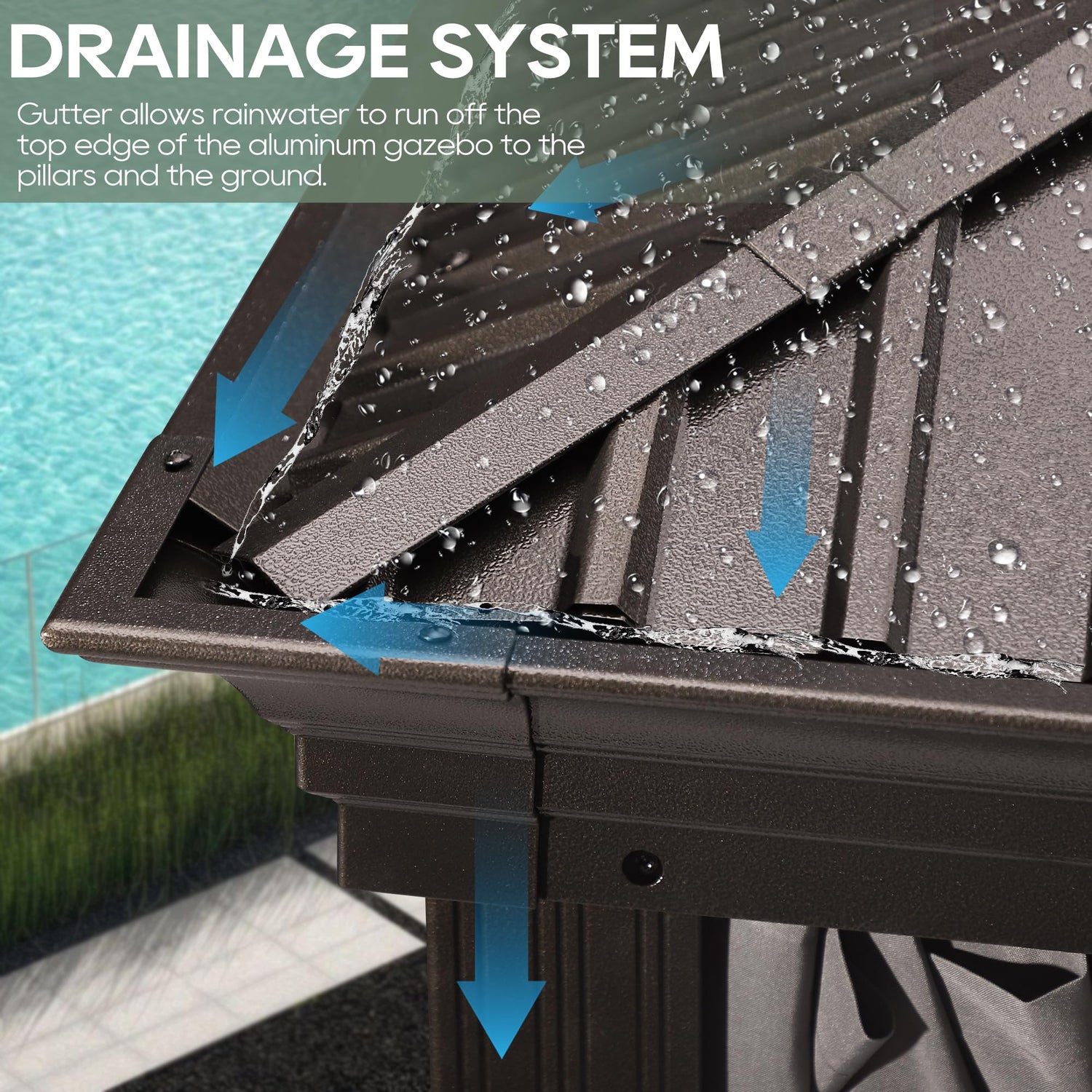 - 【DOUBLE TOP DESIGN】Instead of polycarbonate roof, our fade-resistant & rust-resistant galvanized steel roof effectively protects you from harmful UV rays and durable enough to withstand heavy snow and wind.This hardtop gazebo features a double roof design for easy ventilation,keeping the structure cool and comfortable on hot summer days.
