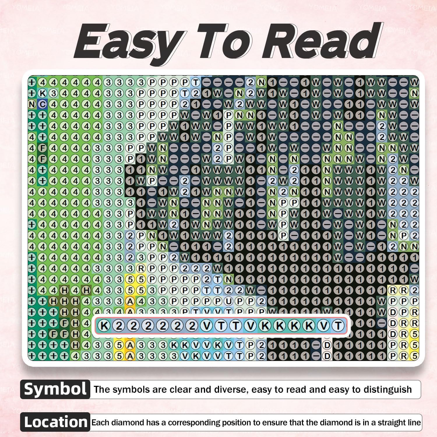 - EASY TO READ: Diamond art numbers and symbols on the HD canvas are clear and easy to read. The drills adhered to the canvas without difficulty, and the diamonds stays on very good, wouldn’t fall off.
