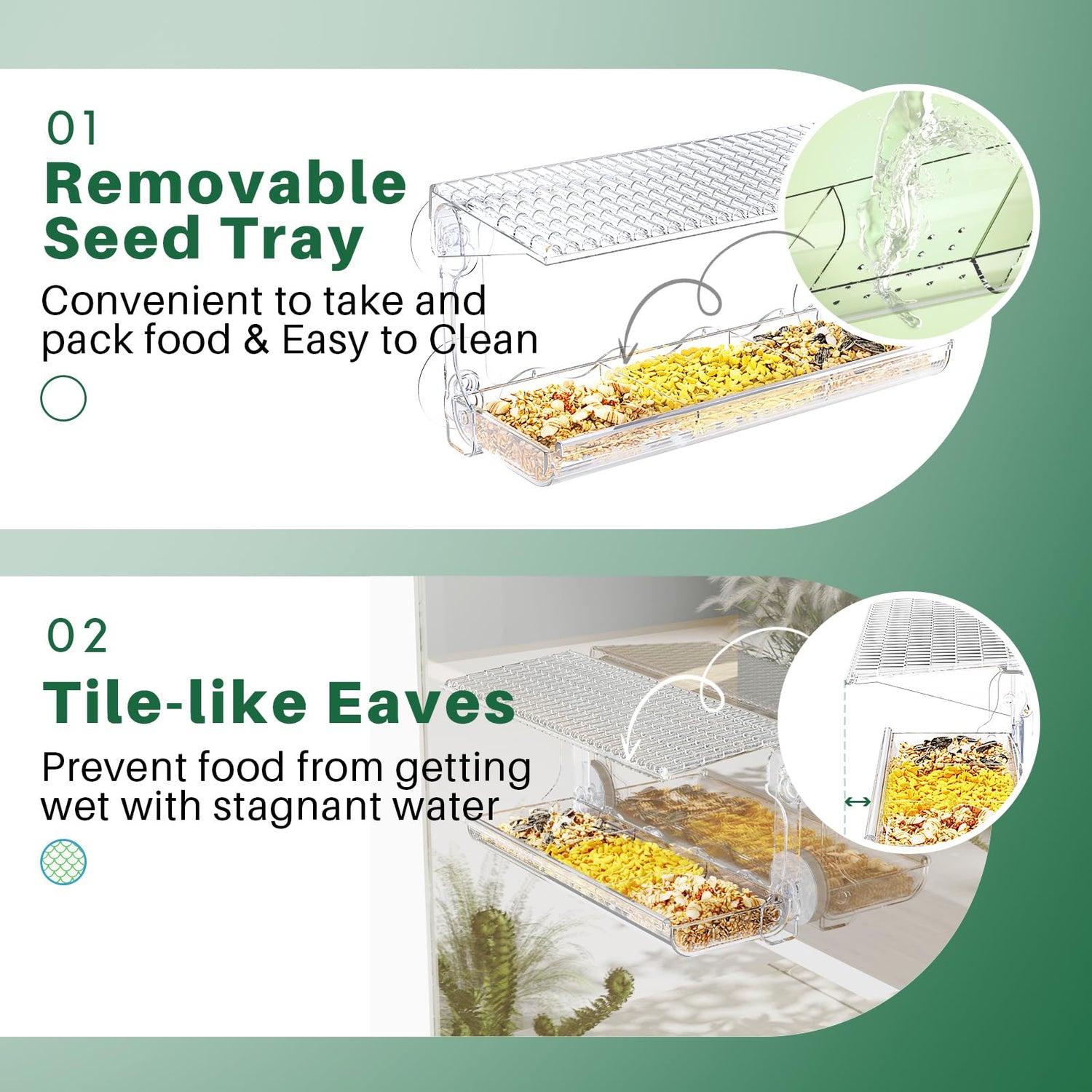 - Larger feeding Trays: This clear bird feeder combines food and water compartments in one integrated design. The 3 compartments on the tray hold different types of birdseed. Its deep tray holds more birdseed and reduces the frequency of loading. The removable tray makes cleaning and seed refilling effortless and folds easily for storage when not in use.