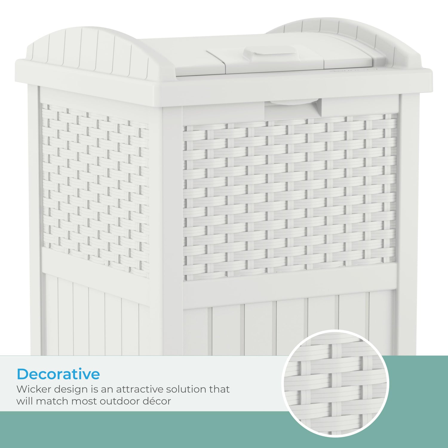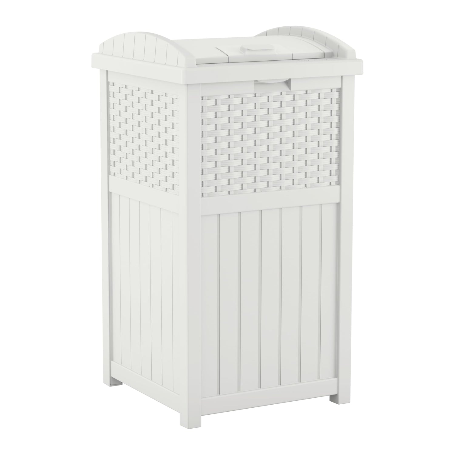 Suncast 33 Gallon Durable Plastic Hideaway Outdoor Garbage Can Trash Bin with Lid and Wicker Design for Backyard, Deck, or Patio, White