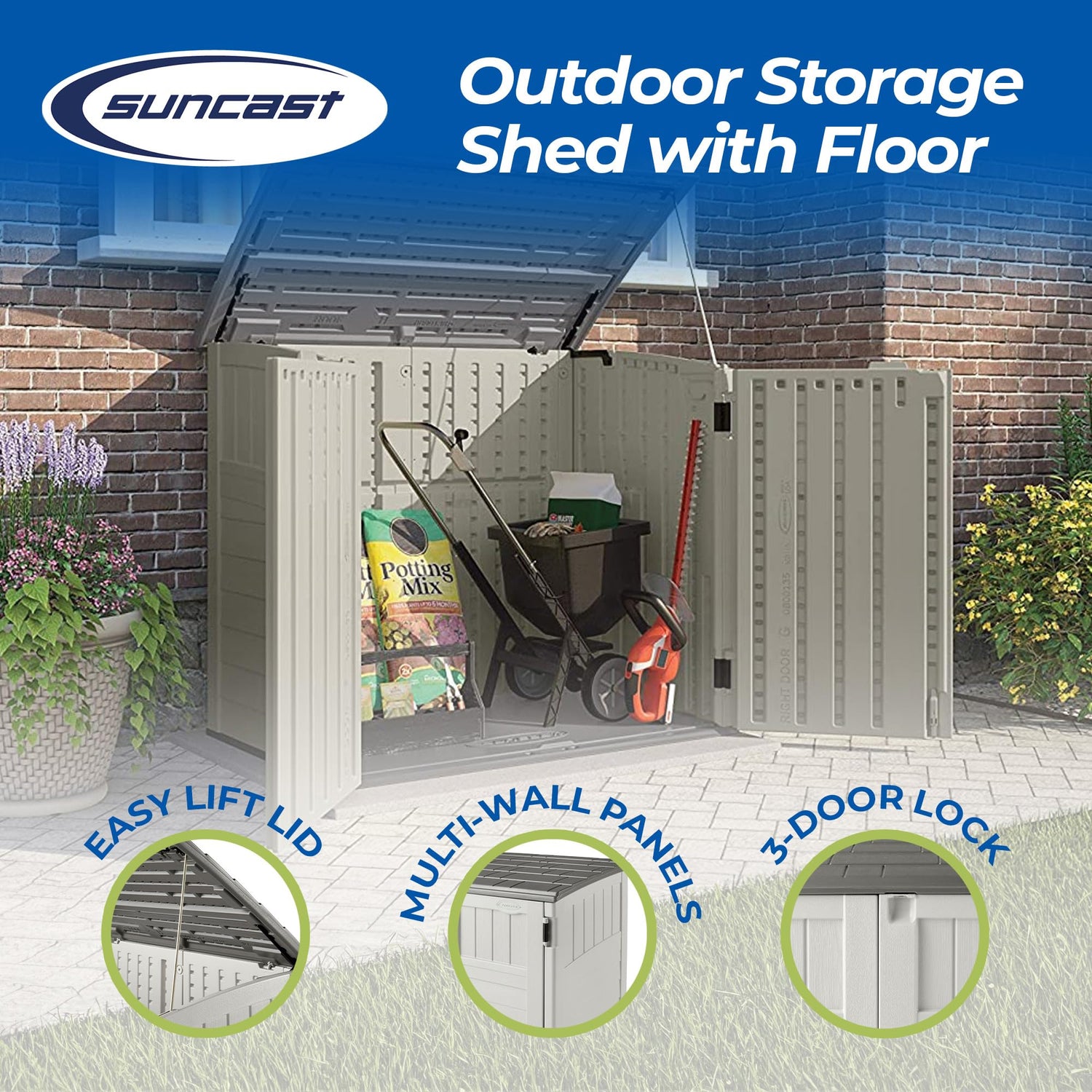 Details: Experience superior outdoor storage with the Suncast Outdoor Storage Shed, a durable and spacious solution for your storage needs. This storage shed is a fantastic addition to any backyard, transforming it into an organized space. The Suncast Outdoor Storage Shed is constructed with high-quality and durable plastic materials, ensuring a robust and long-lasting storage box for years to come. Its sturdy build offers impressive resistance to weather and wear, making it an excellent outdoor storage cabinet. This storage shed comes with an easy lift and double door access which provides seamless entry of your belongings. Suncast Outdoor Shed also features a three-door locking system which provides extra security for your outdoor items or accessories. The Suncast shed is not just functional but also enhances the aesthetics of your outdoor space. Its exterior can blend seamlessly with your outdoor flooring and other elements. The Suncast Shed caters to a wide array of needs. It can be used as a bike tent, an outdoor storage box, or even a tool storage shed. Thanks to its 34-cubic-foot shed size, it offers ample space for a variety of items. Keep your outdoor space free from any clutter and experience the convenience of having a spacious and durable storage area right in your backyard with the Suncast Outdoor Storage Shed.