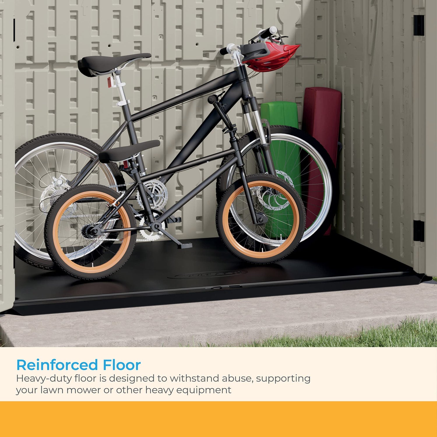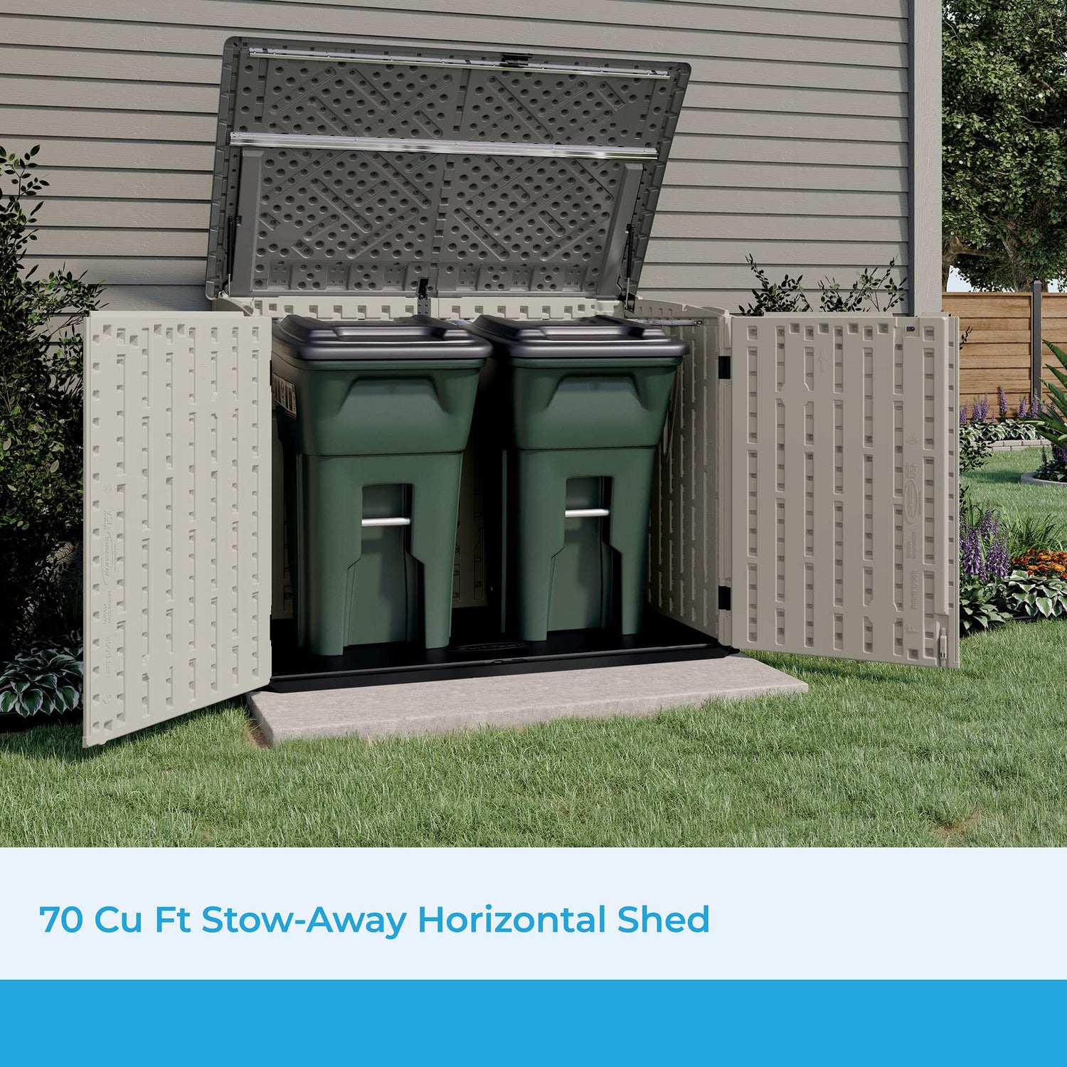 Details: Storage space can be a problem, let the Suncast Glidetop Horizontal Shed be your solution. This medium sized 5. 4 ft. x 3. 2 ft. shed offers a spacious capacity of 70 cu. ft. and features wide double doors with a hinged lid, allowing you to move and store oversized items with ease. With a sleek, low-profile design, it is the ideal compact storage space for trash cans, bikes, mowers and patio furniture. The outdoor storage shed is constructed of blow molded resin that is both durable and strong. Resin is easy to clean and will not rust or rot, for an attractive and professional-looking space that will last a lifetime.