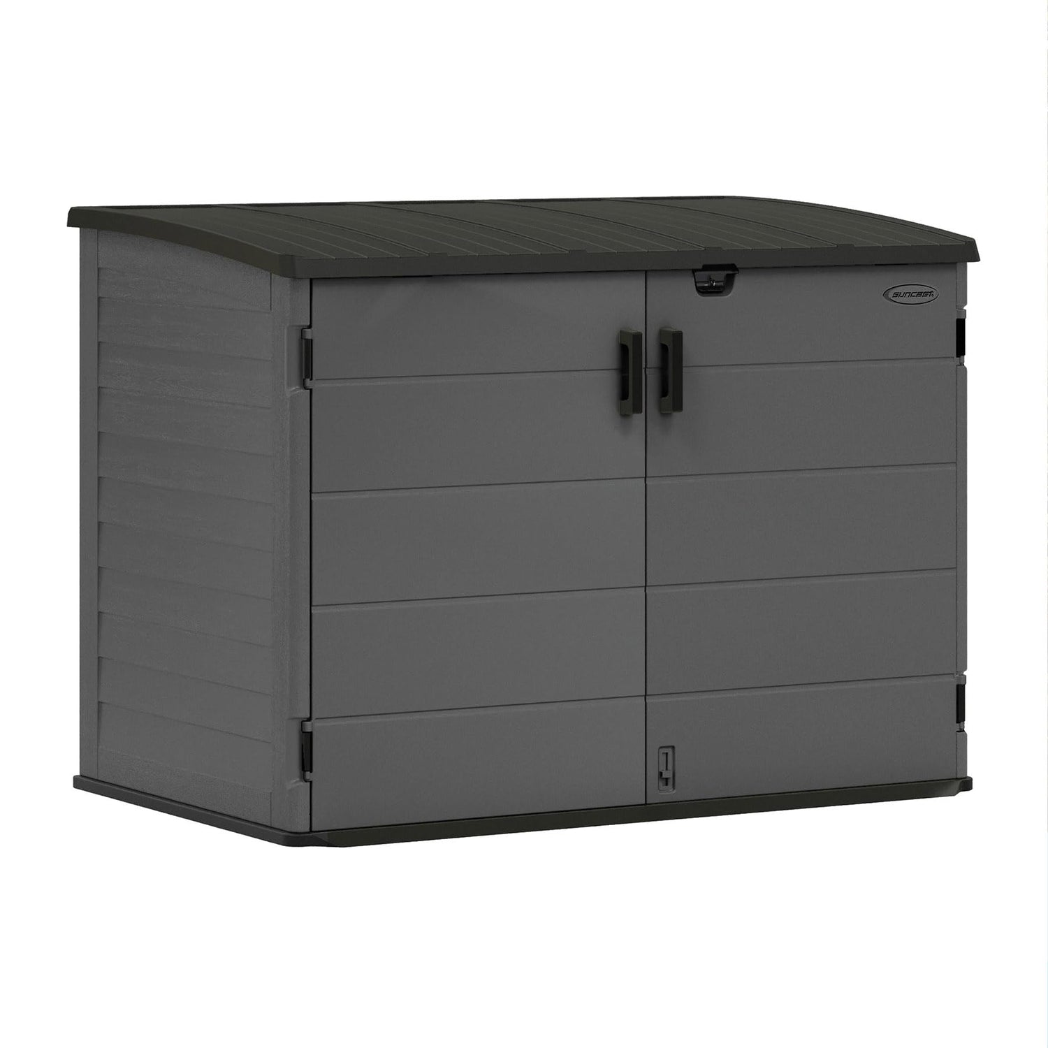 Suncast 70 Cu Ft Stow-Away Horizontal Outdoor Shed - Small Outdoor Storage Shed, Lockable & Weatherproof Resin Plastic, Fits Two 96-Gallon Trash Cans, Bikes, Lawn Mowers, or Garden Tools, Peppercorn