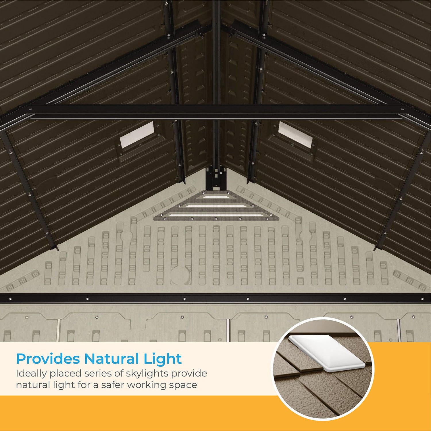 Details: Storage space can be a problem, let the Suncast Tremont Resin Storage Shed be your solution. This large 8 ft. x 7 ft. shed boasts a large capacity of 378 cu. ft. Large double doors with windows allow you to move and store large items within your shed. The Suncast Tremont shed is constructed of blow molded resin that is as durable as it is strong. Resin is easy to clean and will not rust or rot. The roof is constructed of durable resin and reinforced with a metal truss system. Also included in the roof are 4 skylights for easily navigating your shed in the daytime with natural light. Also included are 2 corner shelves and a resin floor.