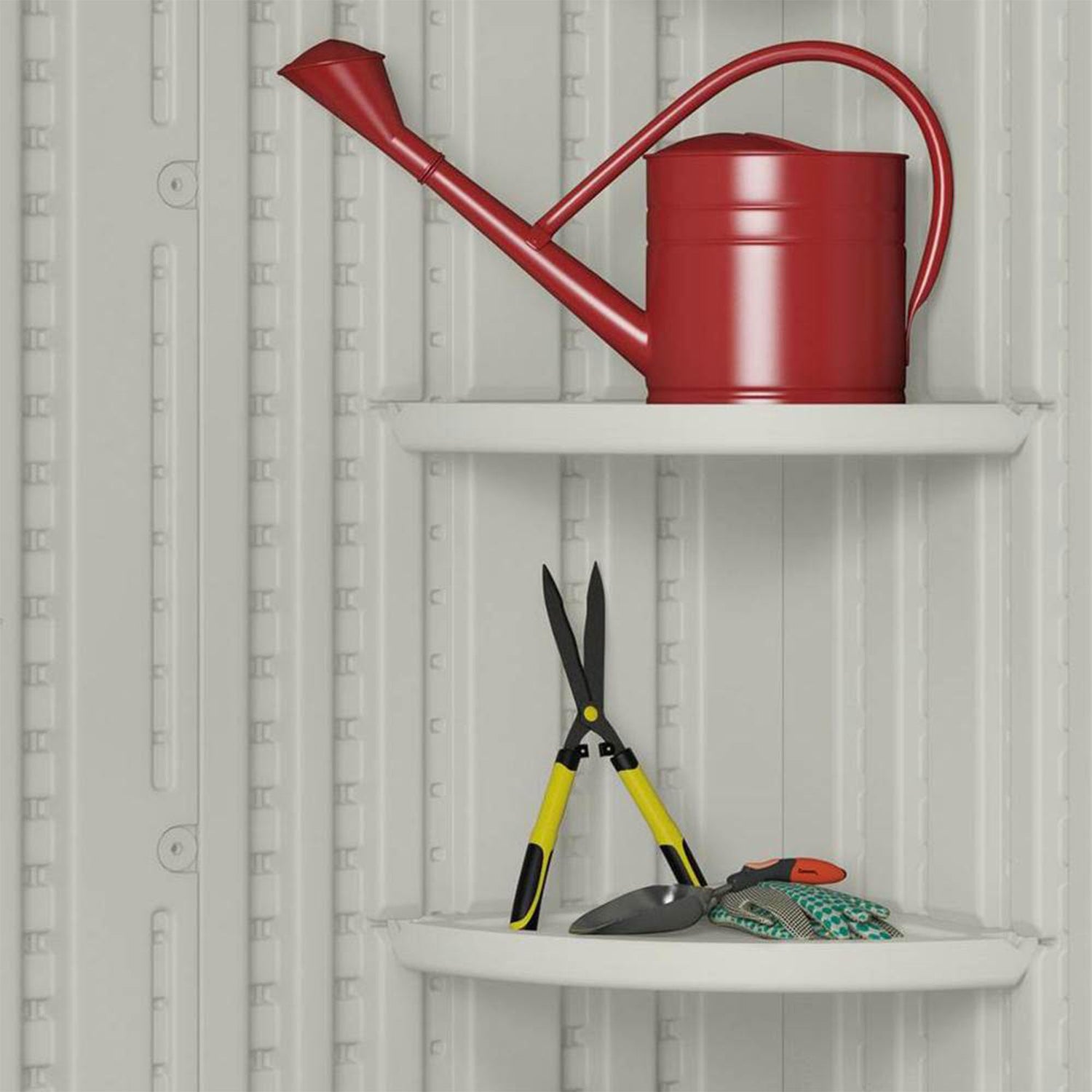 Details: Maximize your storage space with the Steel Reinforced Resin Shed, built to last and designed to keep your items safe and organized. Constructed with durable double-wall resin and reinforced with steel, this shed offers superior strength and weather resistance to withstand the elements and provide long-lasting durability. The metal-reinforced shingle-style roof panels not only enhance the shed's classic design but also ensure reliable protection against the elements. Inside, the shed features 2 corner shelves with 8 optional locations, giving you flexible storage options for tools, equipment, or seasonal items. Additionally, 2 skylights let natural light illuminate the space, making it easier to find what you need. For added security, the shed includes pad-lockable metal handles (lock not included) and a reinforced floor to support heavy equipment like a tractor. The 206 cubic feet capacity provides ample space for a wide variety of items, while the 60 x 72-inch door opening allows for easy access to your stored goods. Available in three stylish colors—Vanilla, Stoney, and Slate—this shed adds a functional yet aesthetically pleasing touch to any backyard or garden. Additional shelving, a loft kit, and hook and basket accessories are available for further customization. Enhance your outdoor storage with this versatile and secure storage shed from Suncast.