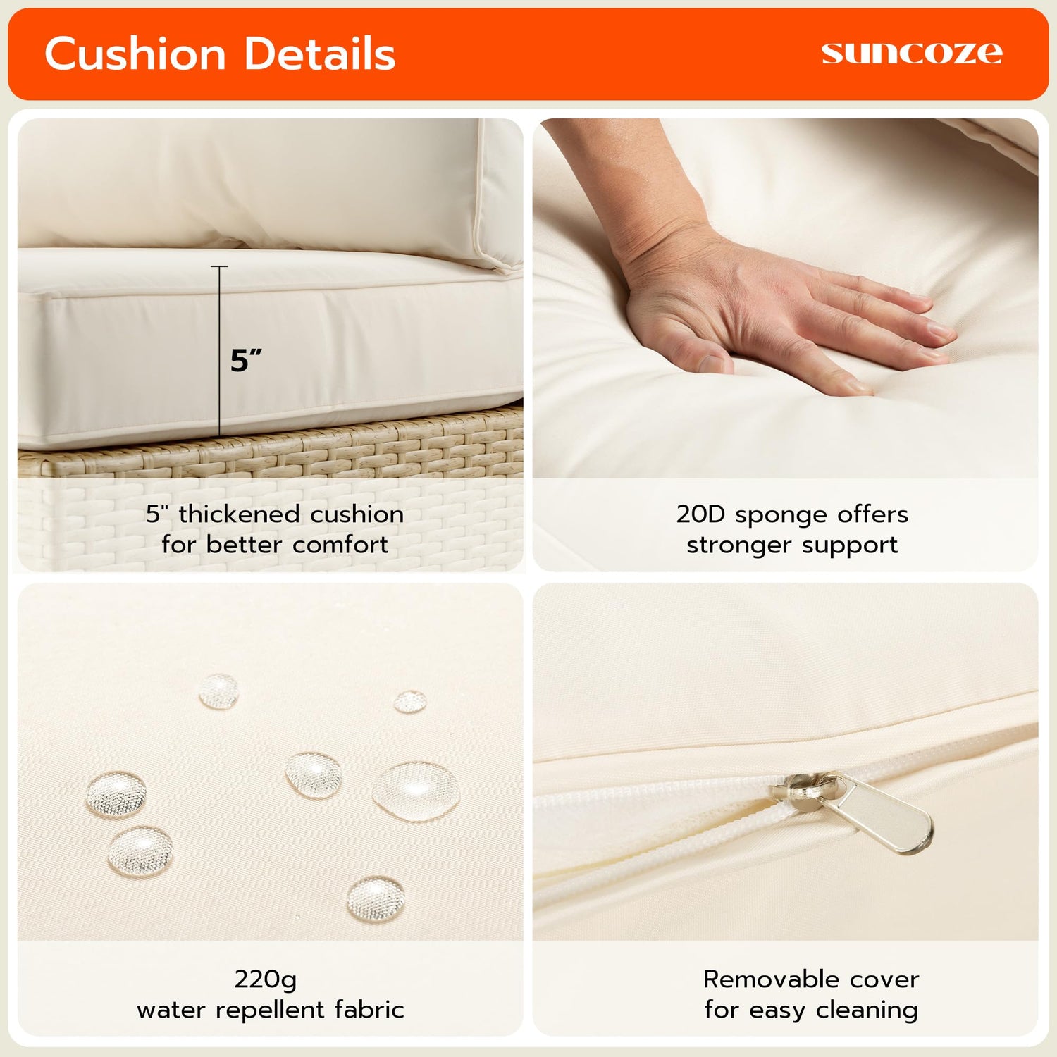 - 🌞5" CUSHION FOR MORE COMFORT - The patio conversation sets offer exceptional comfort with 5" super thickened cushions which filled with high-resilience sandwich sponge, it also includes 6" supportive backrest ensuring a cozy and luxury outdoor experience than others. In addition, the removable and machine-washable covers are easy to clean and maintain