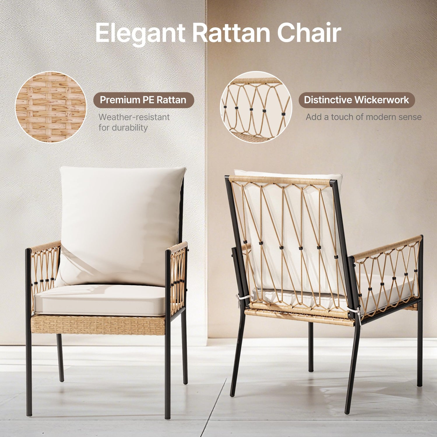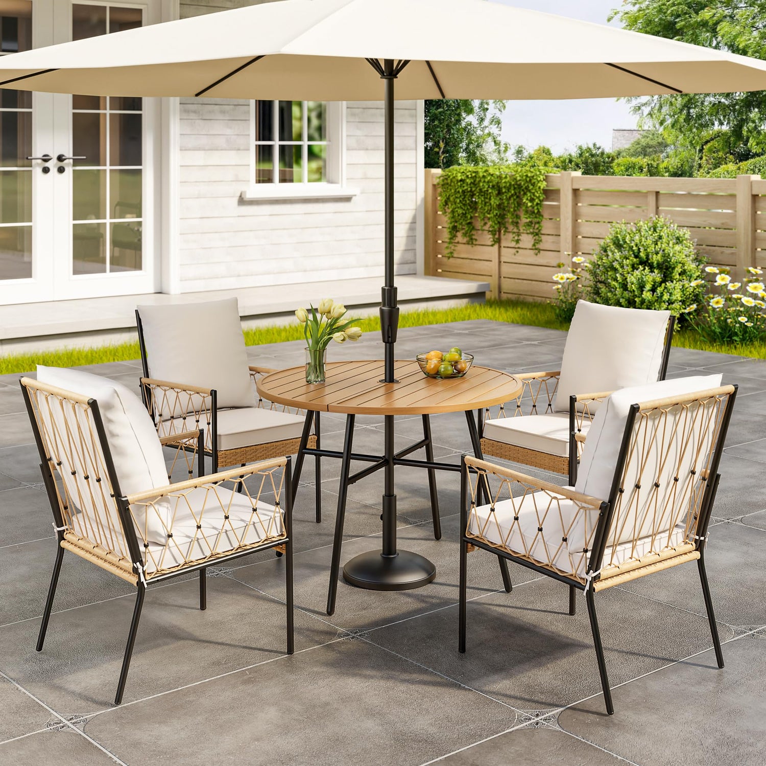 - BOHO CHIC OUTDOOR DINING: Elevate your outdoor space with this 5-piece PE Rattan Patio Dining Set, blending boho charm with modern design. The set features a stylish dining table with an umbrella hole and four chairs, all chairs with rattan weaving for a textured, artisanal look. Neutral-toned cushions add a touch of softness, while the sleek, contrasting frame exudes quiet sophistication. Perfect for creating a cozy, eclectic dining scene under the open sky
