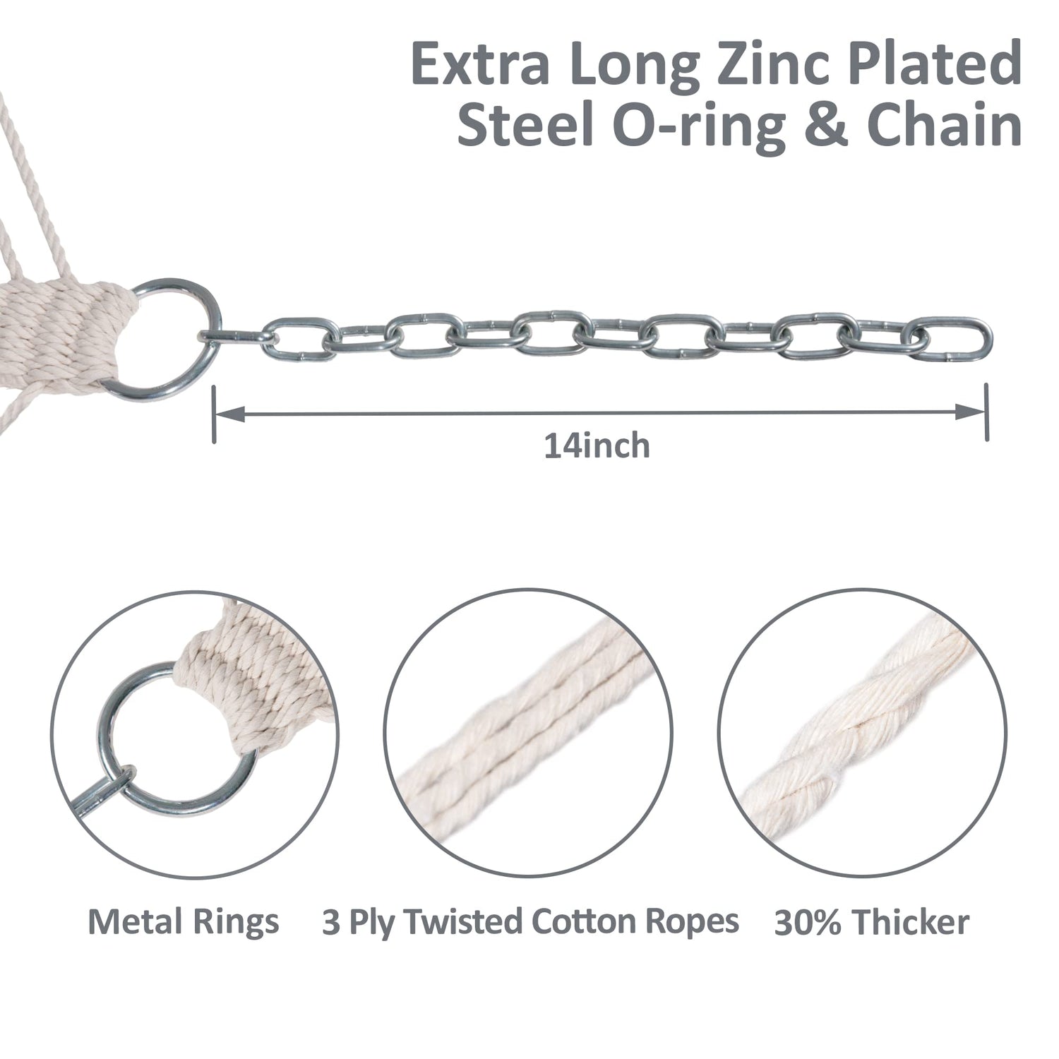 - Upgraded 30% Thicker Ropes: The upgraded strong poly-cotton ropes are hand-woven with comfortable, long-lasting threads woven by the hammock artisans, 30% thicker than before. The 20 ropes are collected together and woven into a triangle pattern which is pleasing to the eye. O-shaped steel ring attaches the ropes and the chain