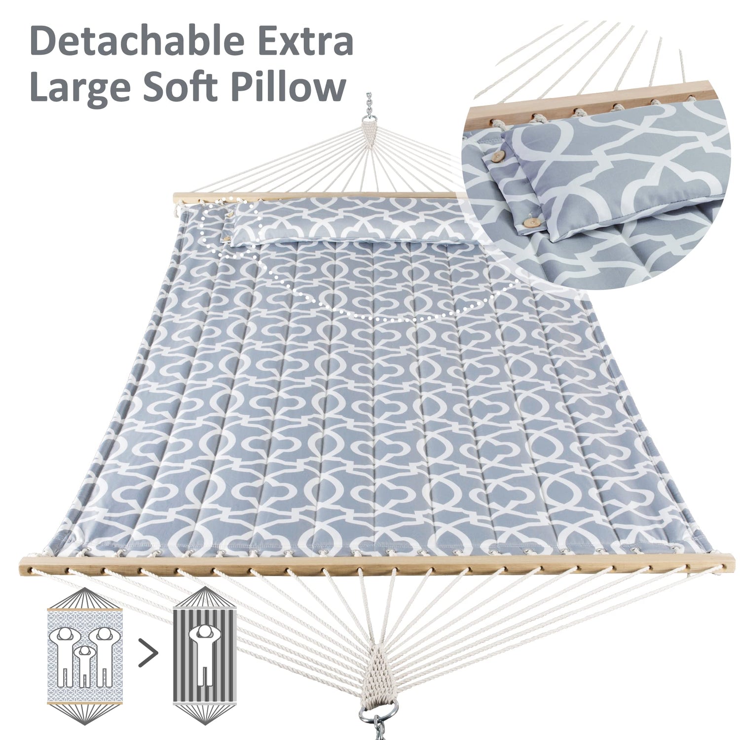 SUNCREAT Double Quilted Hammock with Hardwood Spreader Bar, Extra Large Soft Pillow, Heavy Duty 2 Person Hammock for Indoor, Outdoor, Grey Pattern