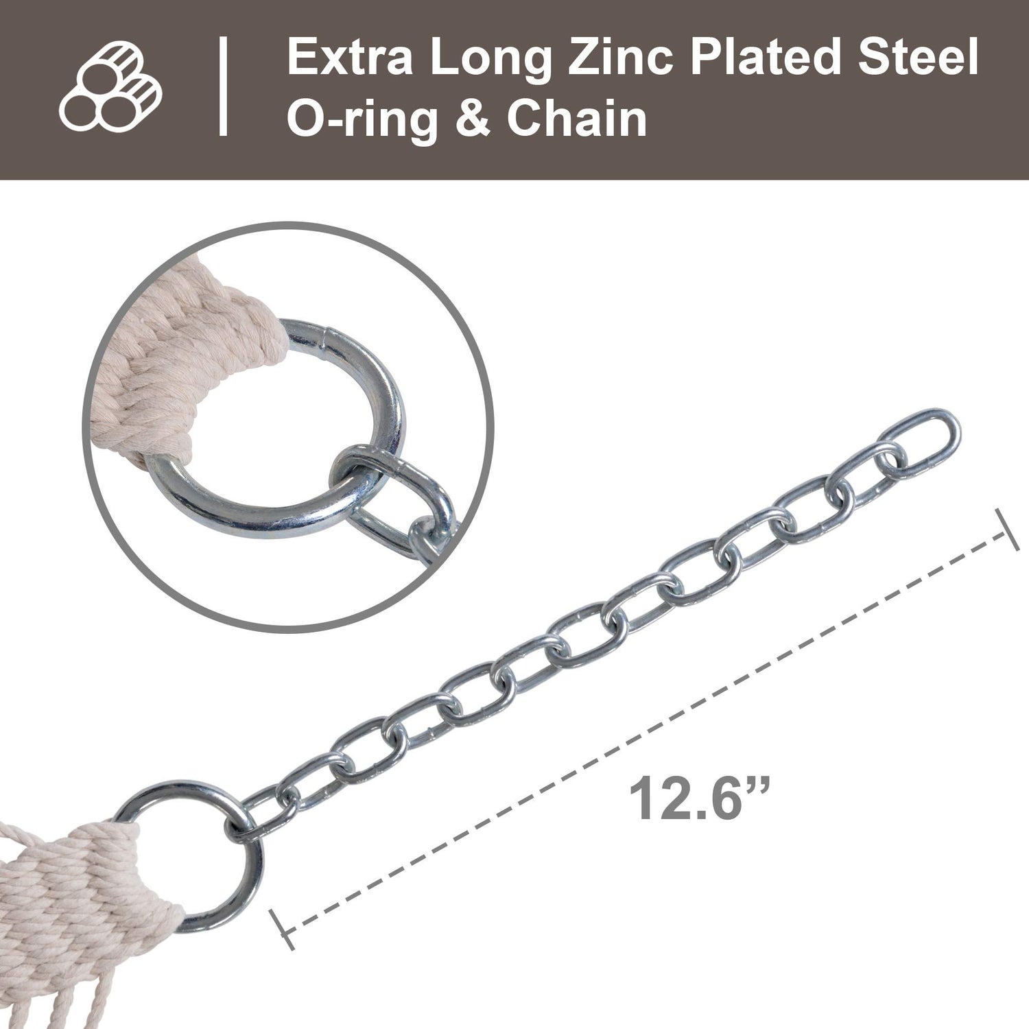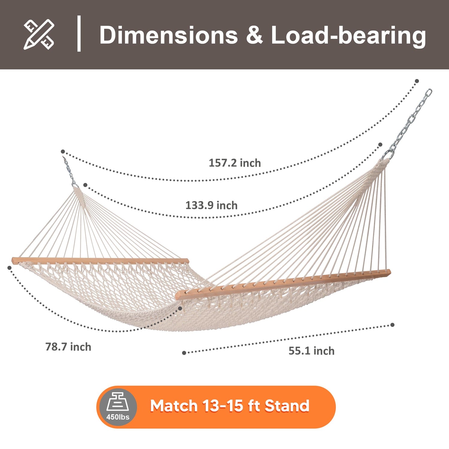 - Heavy Duty Double Hammock: With 12.6 inch steel chain at each end, the total Length can be 13.1 feet. The bed dimension is 78.7 x 55.1 inches. There is plenty room for two adults. Max weight capacity: 450 lbs. You can share the relaxation with your friends or family members. Feel free to contact us if you have any questions during use within one year of purchase. We are always here to help