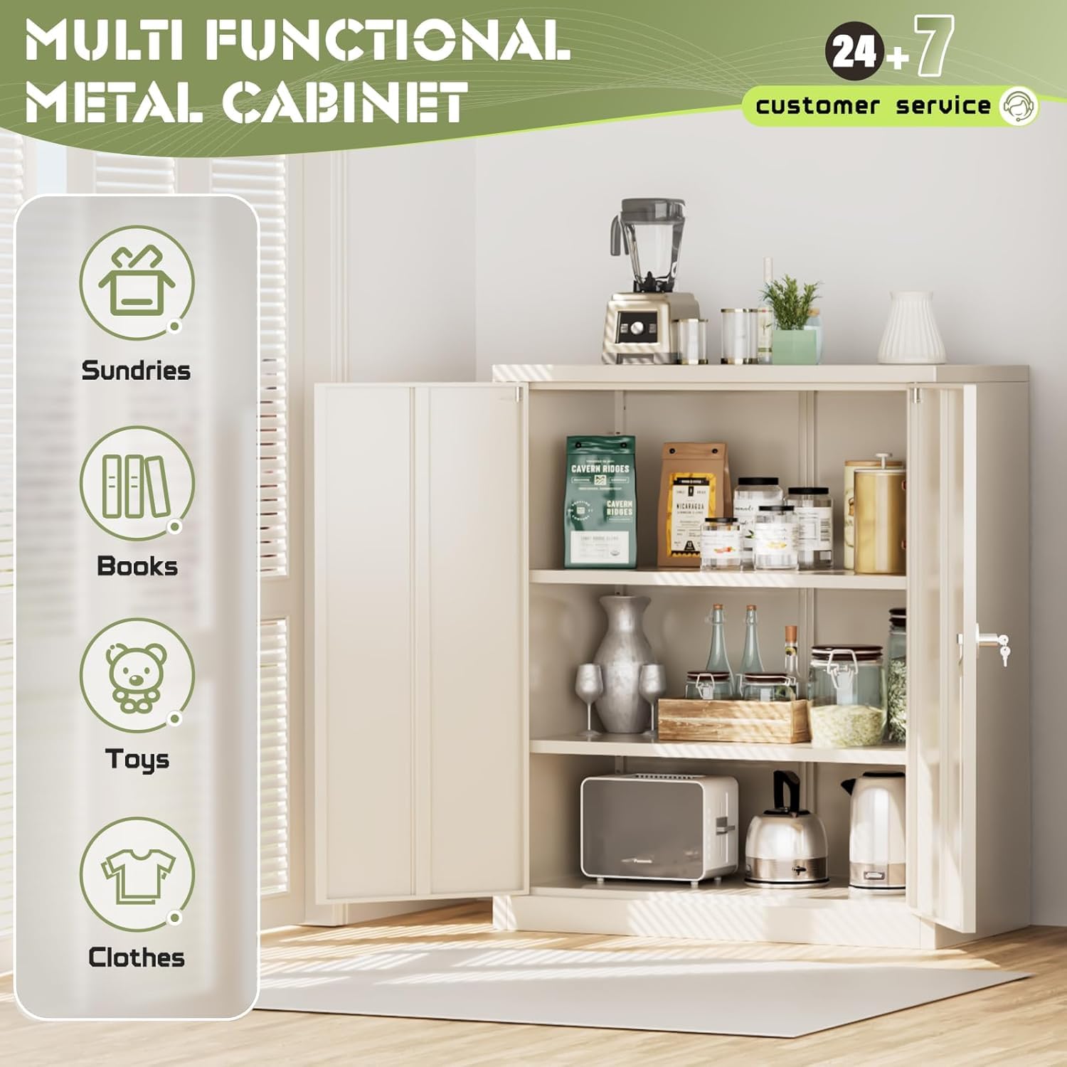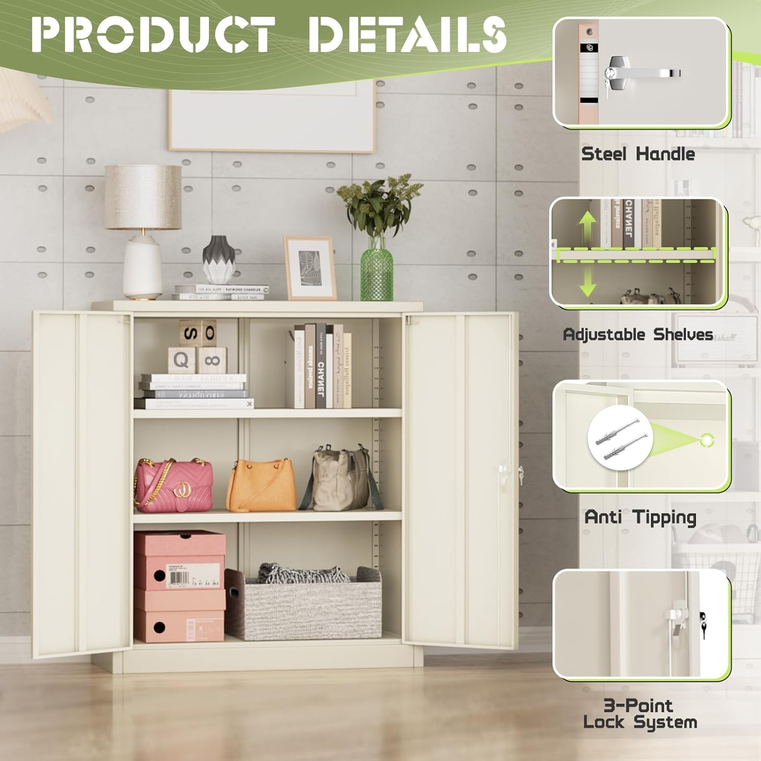 - 【Upgrade design】The metal storage cabinet features 2 adjustable shelves to accommodate items of various sizes. Each shelf can bear a weight of 180 pounds. There are reserved holes at the back of the cabinet for wall installation, and it has an anti-tipping design.