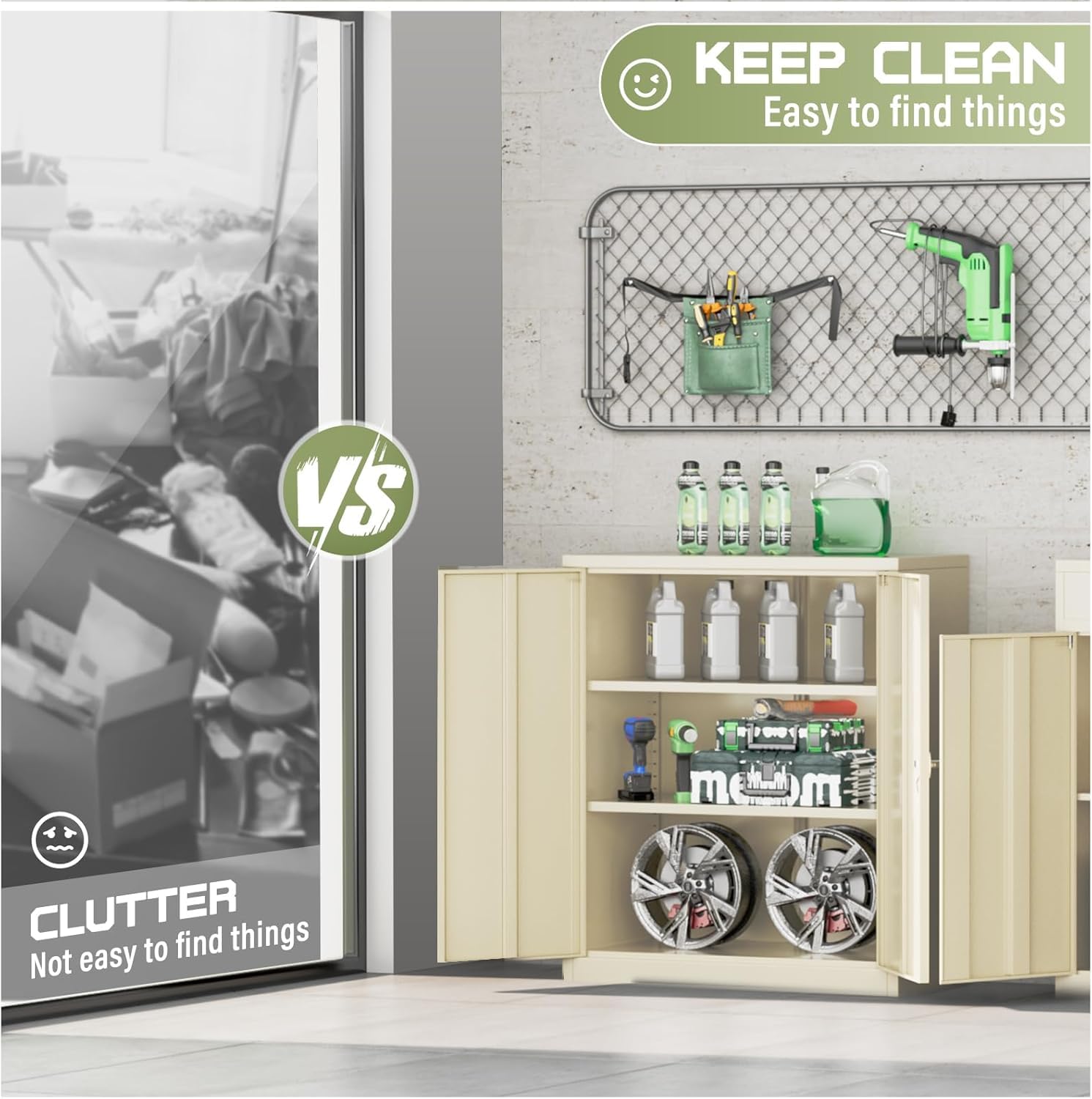 - 【High quality metal materials】Our metal storage cabinet is meticulously crafted with high-quality 0.5mm steel plates. We reinforce each cabinet shelf with additional steel bars to prevent the partitions from deforming and getting dents. It's scratch-resistant, easy to clean and can prolong the service life of the garage cabinet during frequent use.