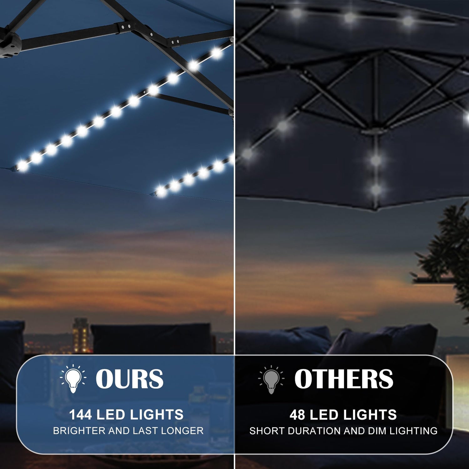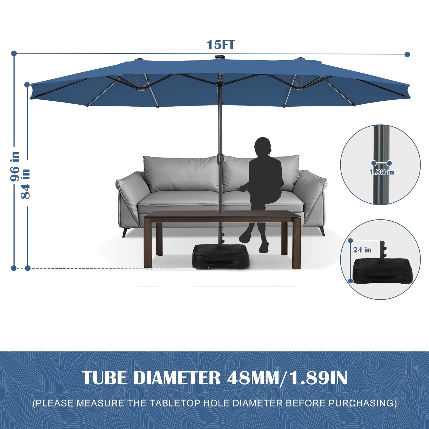 Sundale Outdoor Solar 144 LED 15 ft Patio Umbrella with Sandbag Base Included and Cover, Outdoor Double-Sided Umbrella, Navy