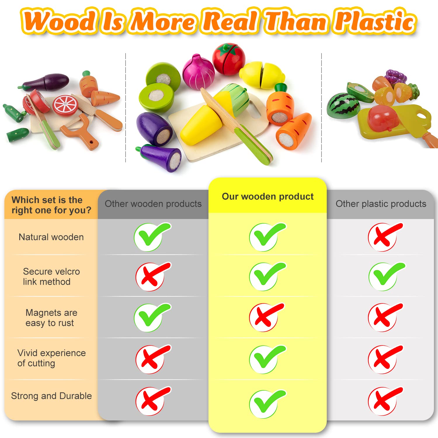- Perfect Gift For Kids: Exquisite wooden toys are very suitable for kitchen set for kids for toddlers 3 years old. the wooden food is spread out and glued together with nylon buckles, making a "crunchy" sound when the children cut the food toys, toddler kitchen playset which can bring the children a realistic feeling, toddler cooking set is the best gift for preschoolers and toddlers for birthdays, if you are not satisfied, please contact us.