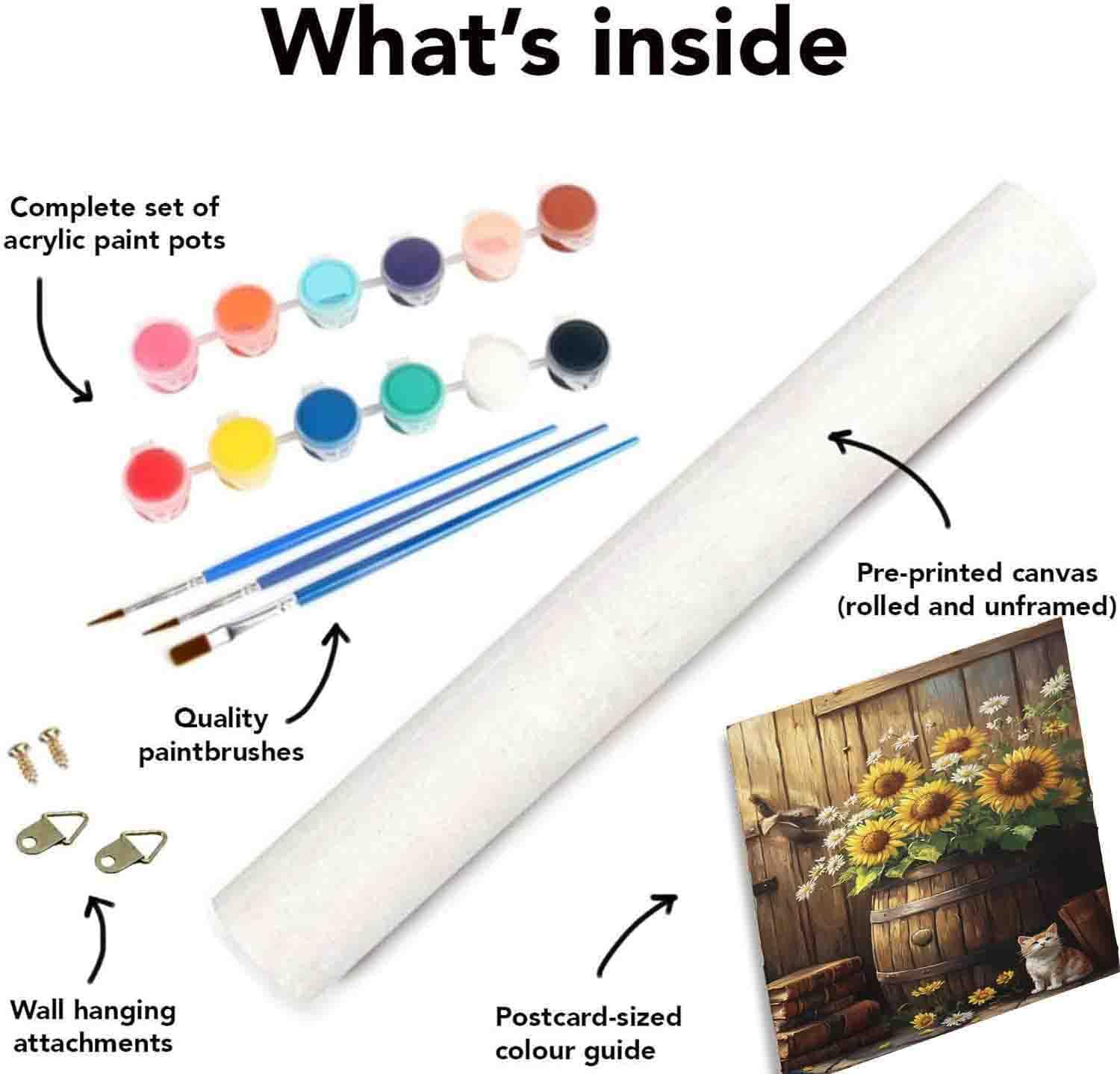 - 【What You Get】Paint by numbers kit for adults include you will get: 1 high-quality, soft, waterproof canvas, 1 set of perfectly matched acrylic paints,1 set of high-quality brushes (including 3 different size brushes), 2 sets of hooks, 1 instruction and reference pictures of finished products.