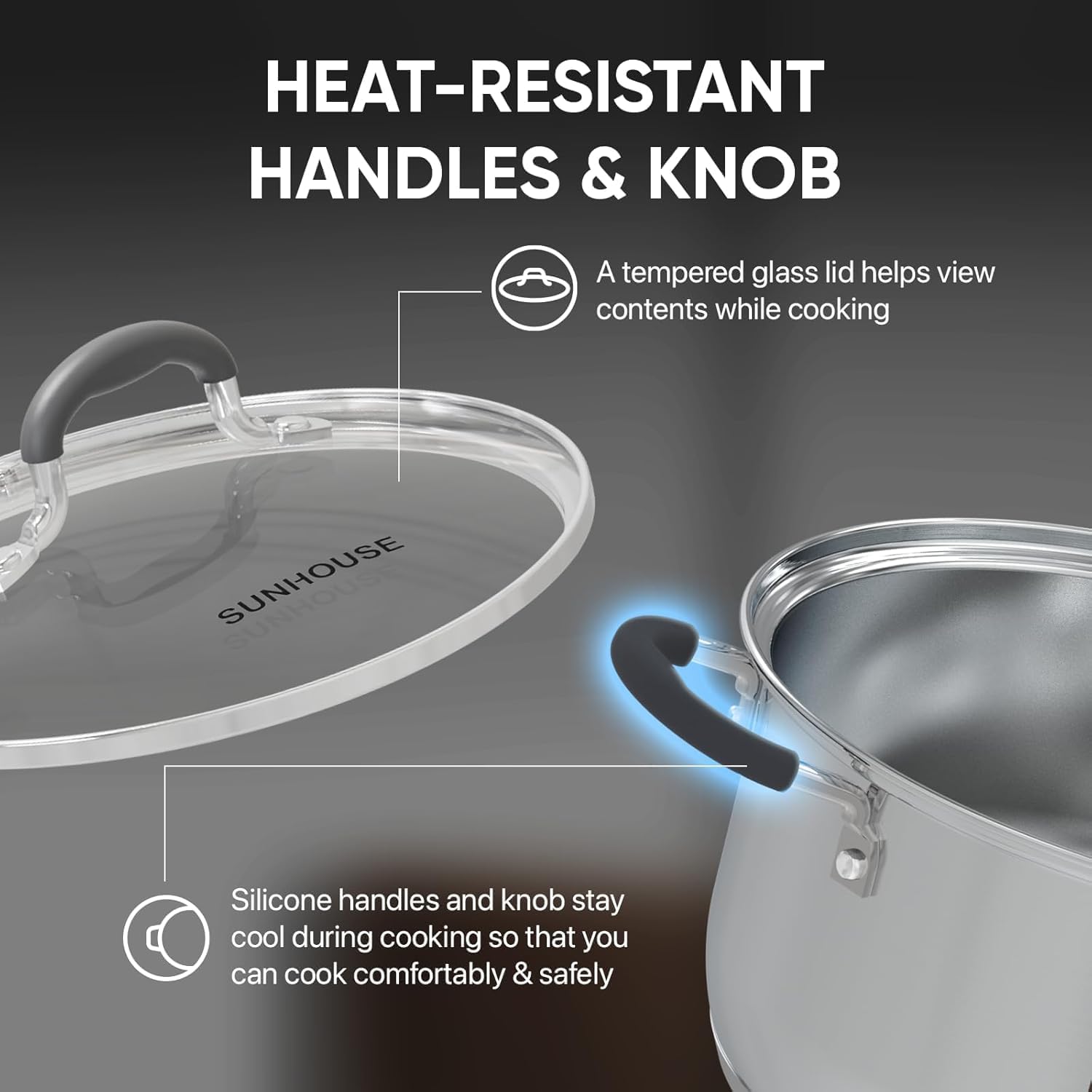 - Visualised Lid & Handle Design - The unique design of handles on both sides allows you to use them more comfortably and prevent burns. The transparent glass lid will let you know the cooking schedule and lock the food's flavour, heat and moisture. In addition, It has "L" measurement lines on the inside of the pot