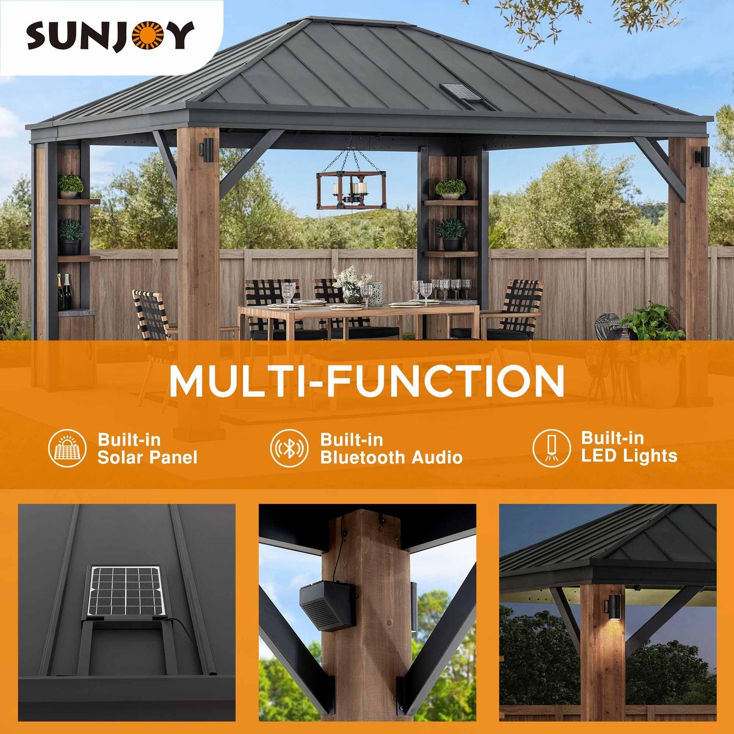 Sunjoy 12 x 14 ft. Hardtop Gazebo with Solar Powered, Cedar Wood Framed Steel Hardtop Gazebo with LED Lighting, Bluetooth Sound and Storage Racks by SummerCove